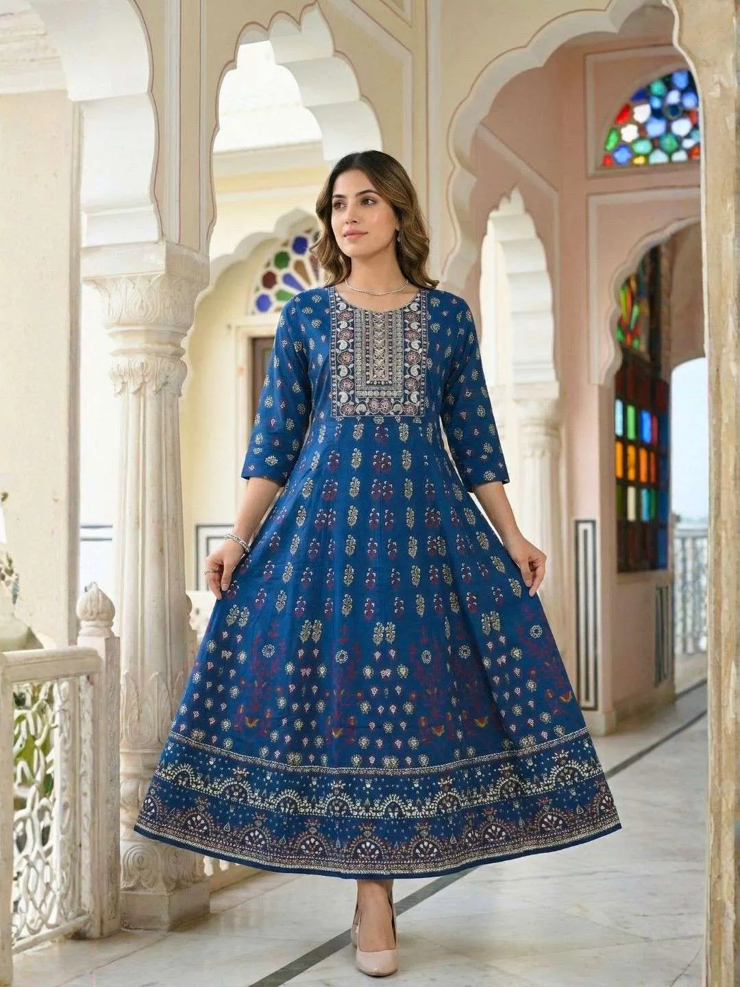 Select your size and add the Azure Sovereign Cotton Anarkali to your cart today to experience the perfect blend of tradition and royalty!