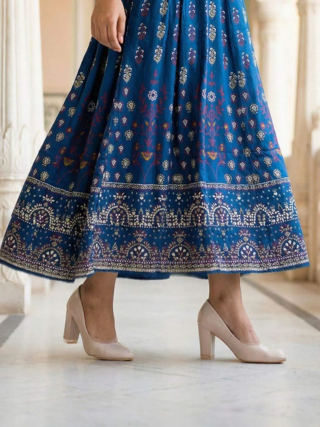 All-Over Print: The body of the Anarkali is adorned with delicate, small-scale foil or block-print motifs. These subtle golden/silver accents shimmer gently under the light, adding a texture of luxury to the solid blue base.
