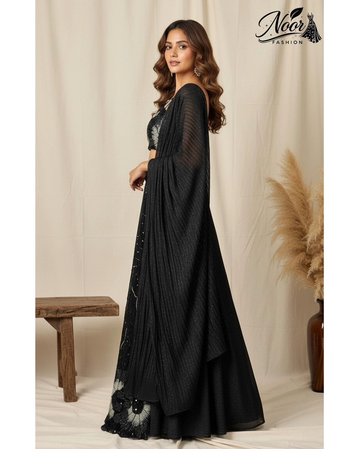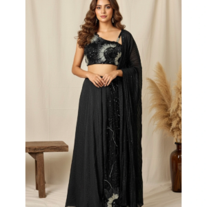 Elevate your evening wardrobe with this breathtaking Black Lycra Shimmer Drape Saree from Noor Fashion Nepal. Designed for the modern woman who loves the elegance of a saree but craves the comfort of a contemporary silhouette, this outfit is a showstopper. Whether it’s a high-profile wedding, a cocktail party, or a festive celebration, this ensemble ensures you remain the center of attention.