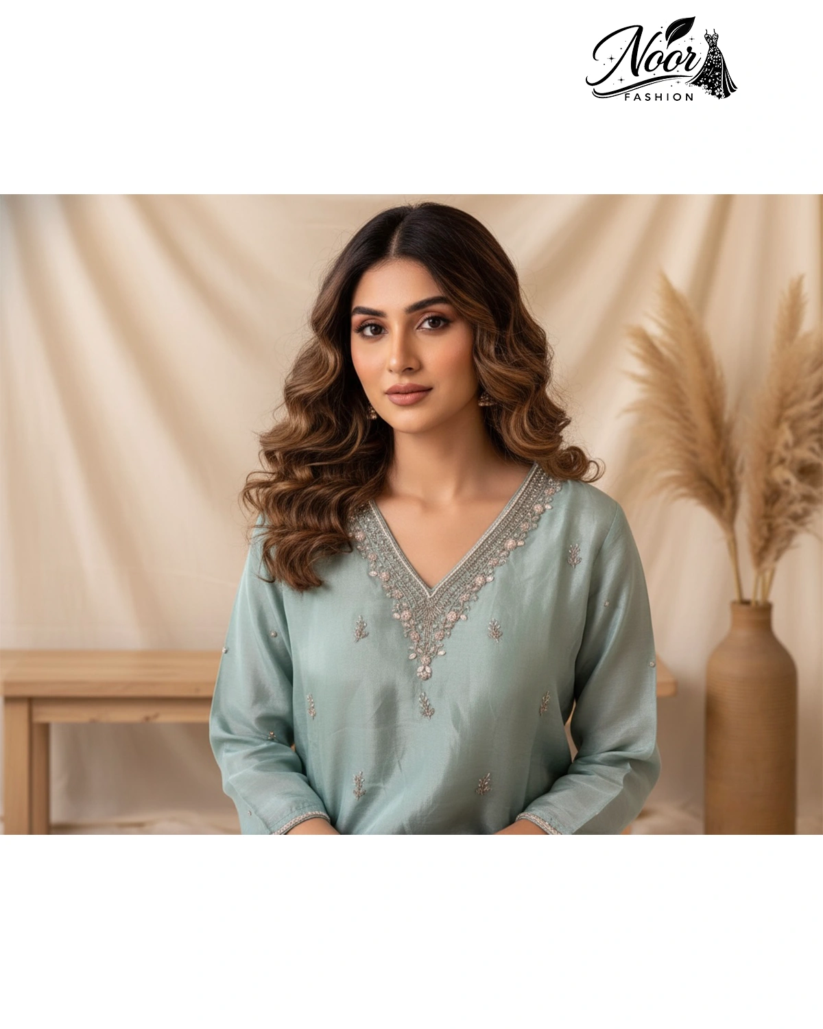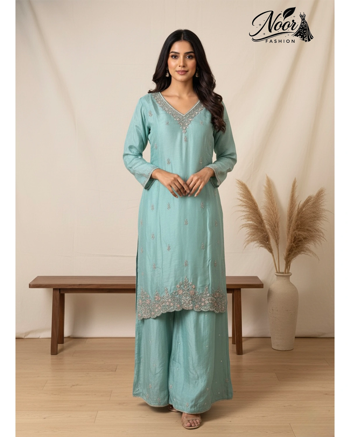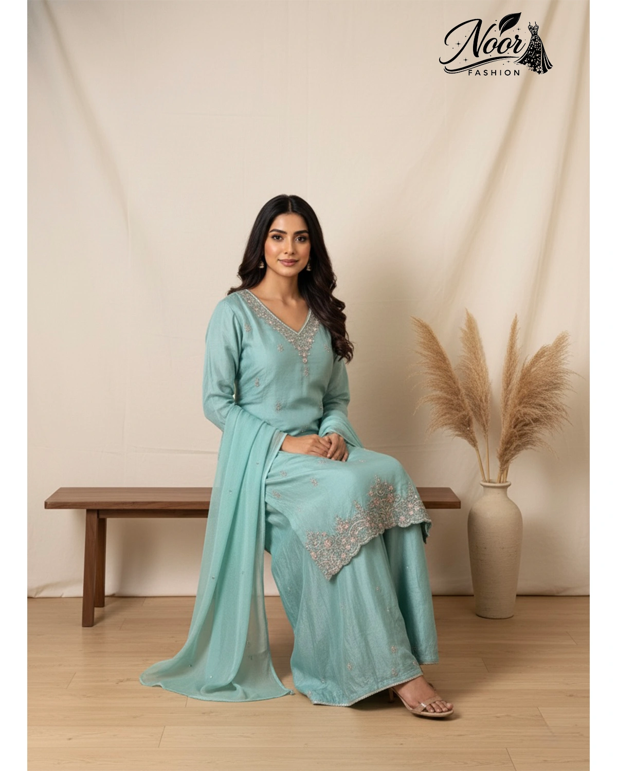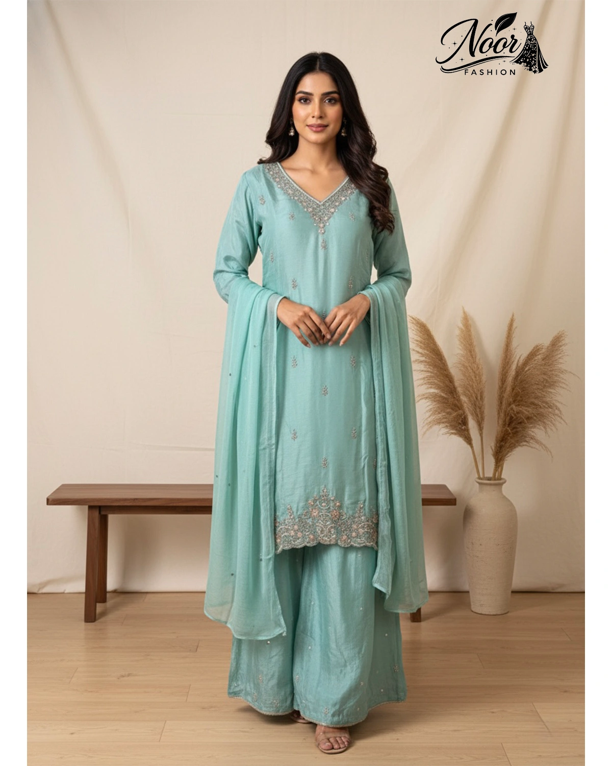 Step into a world of serene elegance and timeless tradition with our latest addition to the Noor Fashion luxury collection. This ensemble captures the essence of sophisticated ethnic wear, blending the heritage of intricate needlework with a modern, fluid silhouette perfect for the contemporary woman.