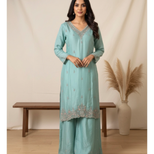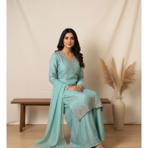 In the evolving landscape of South Asian fashion, the demand for a premium Chikankari Handwork Sharara Suit Nepal has grown significantly among style-conscious women in Kathmandu and beyond. This specific piece is a testament to understated luxury. Crafted from high-grade Viscose Silk, the fabric offers a lustrous sheen that mimics the richness of pure silk while providing the breathable comfort required for long hours of celebration. The cool, pastel teal hue serves as a refreshing departure from traditional reds and maroons, making it an immaculate choice for day weddings, engagement parties, or sophisticated evening soirées.
