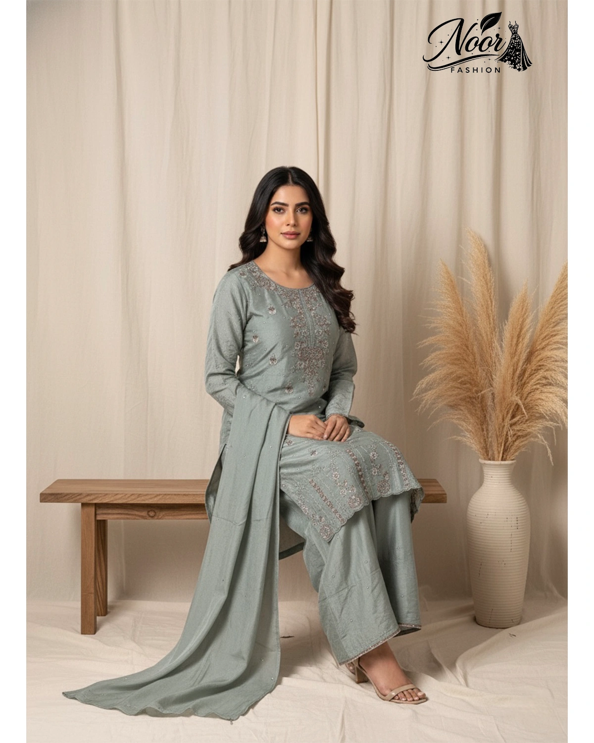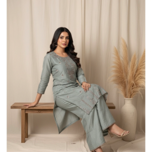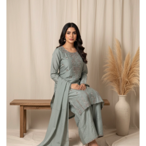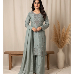 This ensemble is designed for the woman who radiates an aura of “understated royalty.” The muted blue palette provides a sophisticated, calming backdrop for the dense, shimmering embroidery. Whether you are hosting a festive dinner or attending a grand wedding, this suit offers a “vibe” that is effortlessly chic and undeniably premium.
