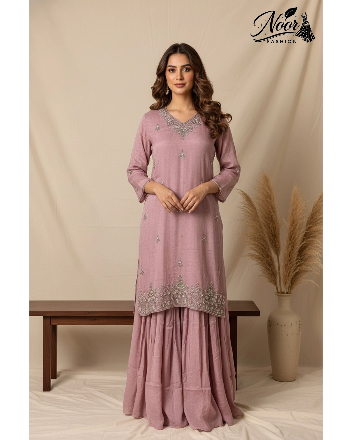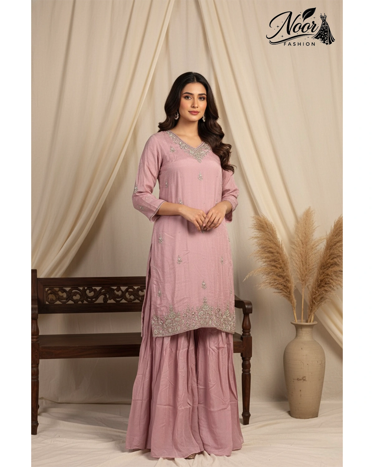 This set radiates a soft, romantic “vibe” that is both regal and approachable. The muted pink palette is universally flattering, while the strategic placement of mirrors around the neckline ensures you catch the light with every turn. Crafted for the modern woman who cherishes heritage details, this gharara set offers a high-impact festive look without compromising on comfort.