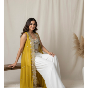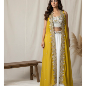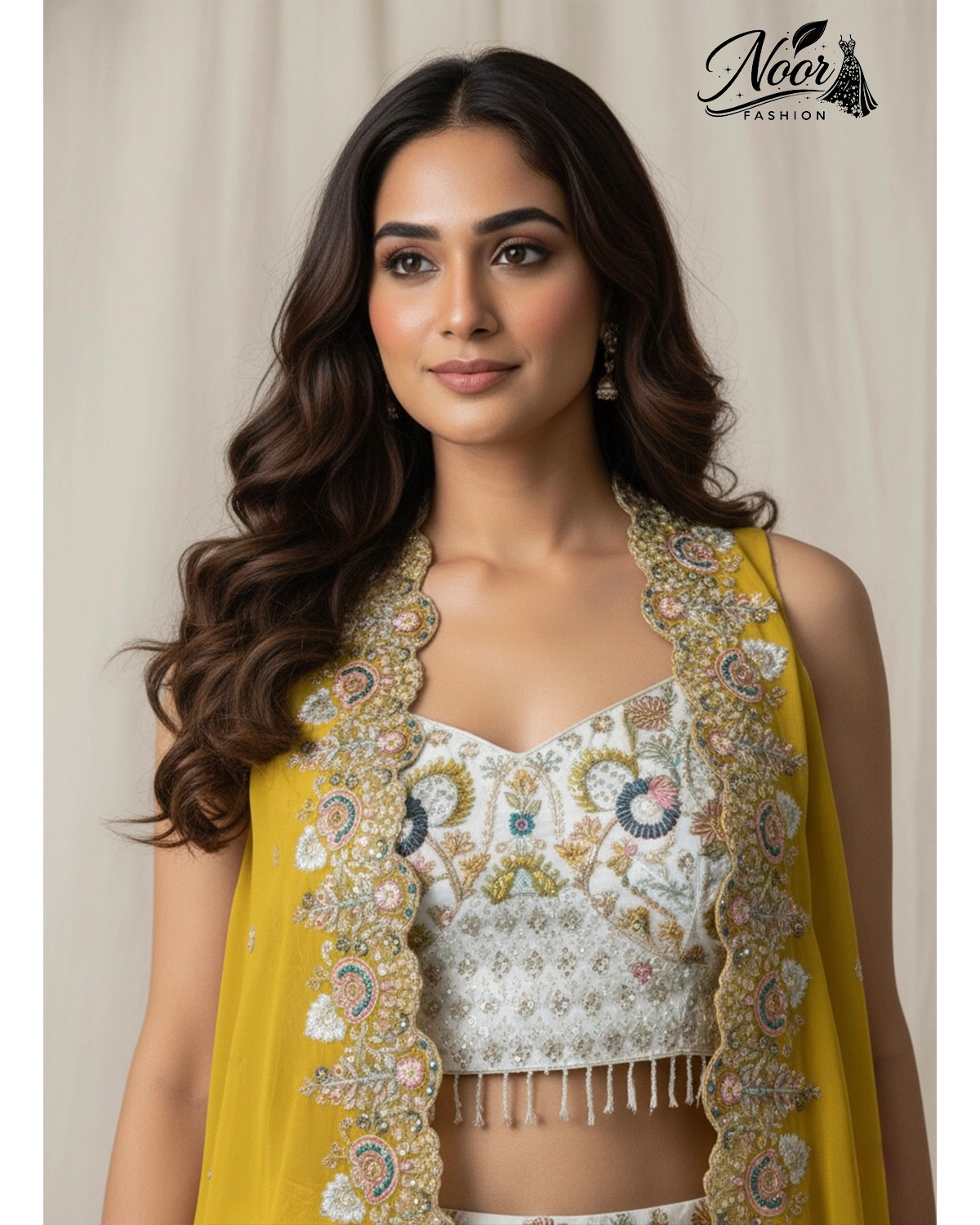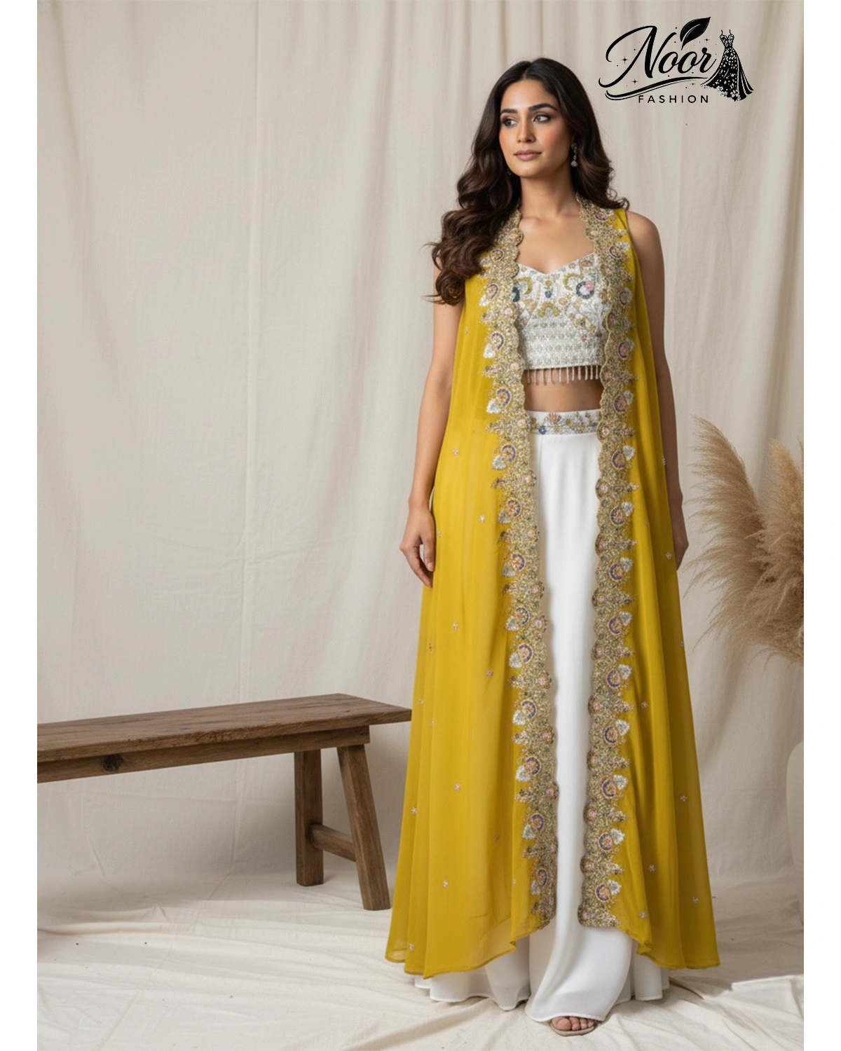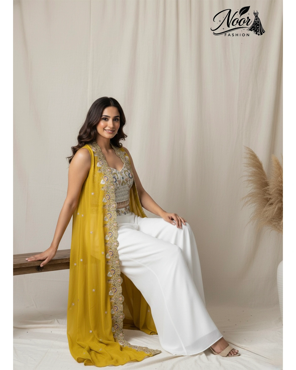 Redefine modern ethnic elegance with this stunning three-piece ensemble from Noor Fashion Nepal. Featuring a masterfully embroidered crop top, ethereal flared pants, and a vibrant contrast cape, this set is the ultimate choice for those who want a break from traditional silhouettes. Whether it’s a high-end wedding reception, a sangeet night, or a festive celebration, this “Cream & Mustard” combination ensures you stand out with effortless grace.