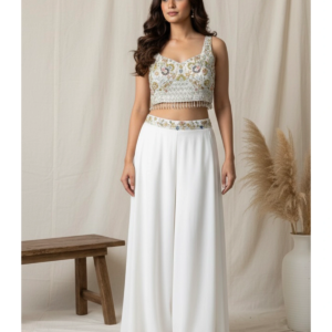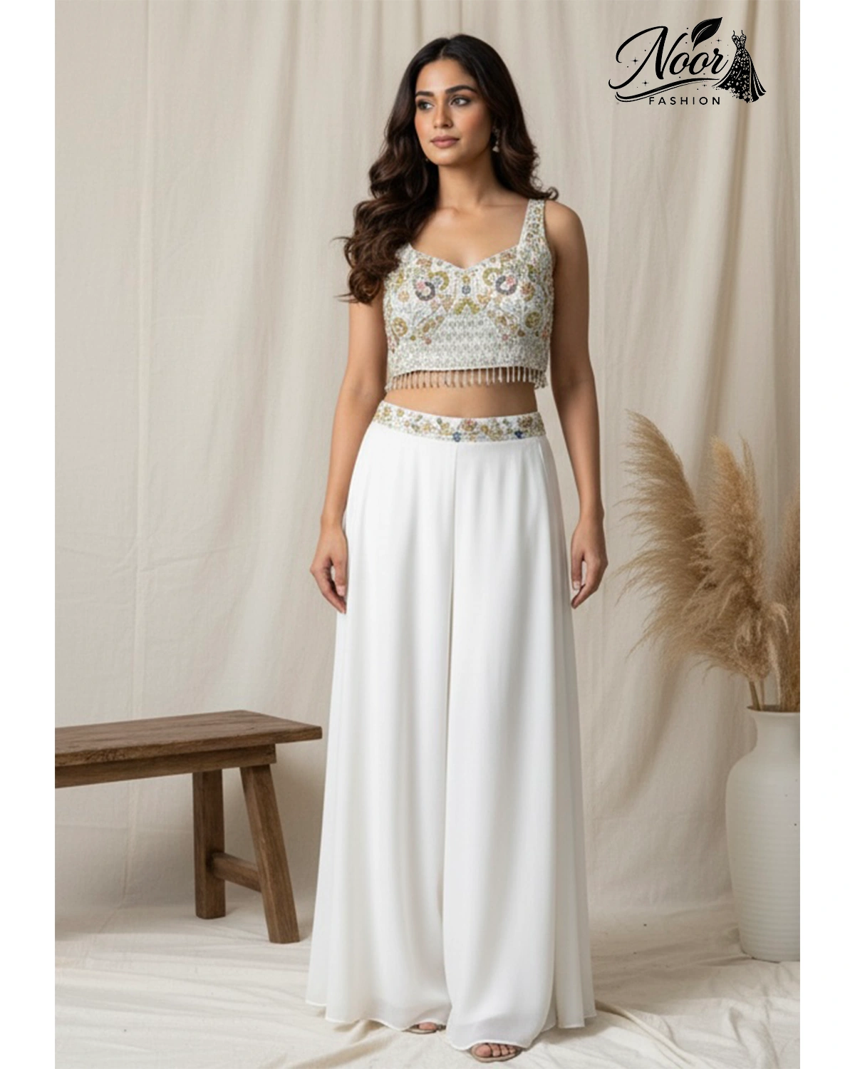 The Flared Bottoms: Balanced by solid, floor-length wide-leg pants (palazzo/sharara style), the silhouette is designed to elongate the frame. The premium chiffon-georgette blend fabric provides a soft, fluid drape that feels as light as air.