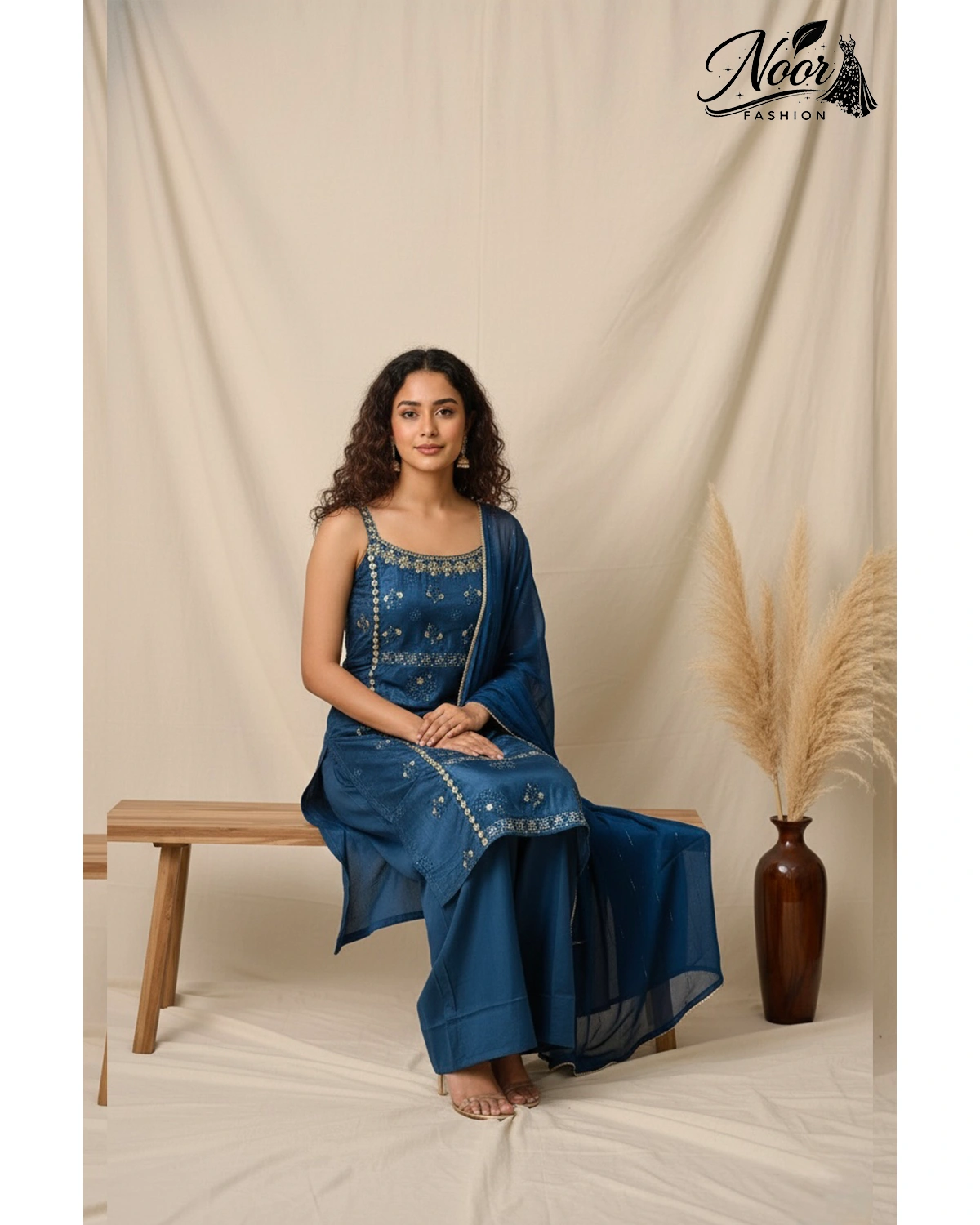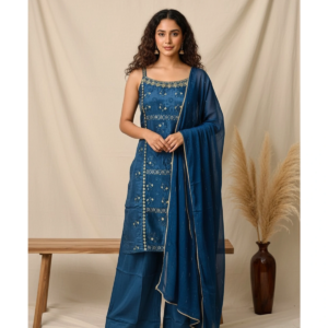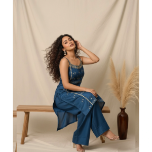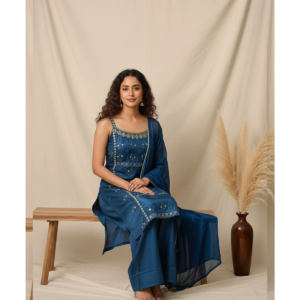 The NF749515 set is designed for the woman who loves to blend heritage craftsmanship with a bold, modern edge. The “vibe” of this outfit is one of youthful elegance and sophisticated ease. The deep, radiant blue hue exudes confidence, while the peplum-sharara silhouette creates a dreamy, elongated look. It is the ultimate choice for festive celebrations where you want to move freely, dance, and look absolutely radiant.