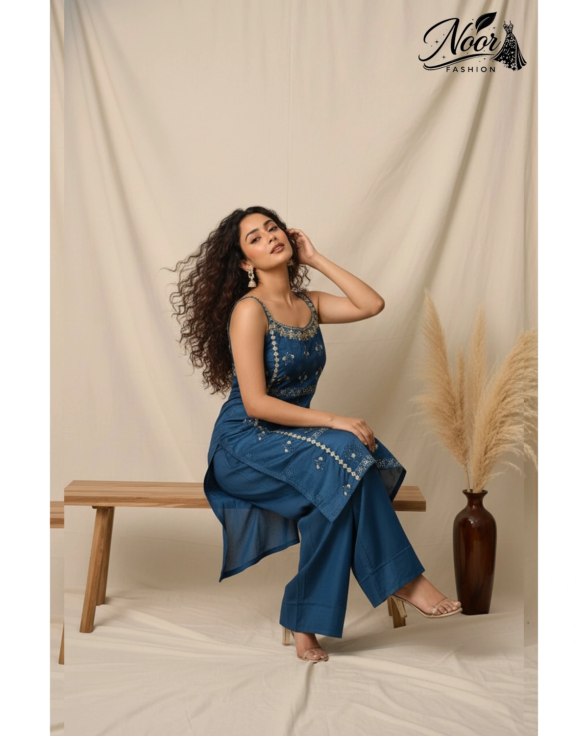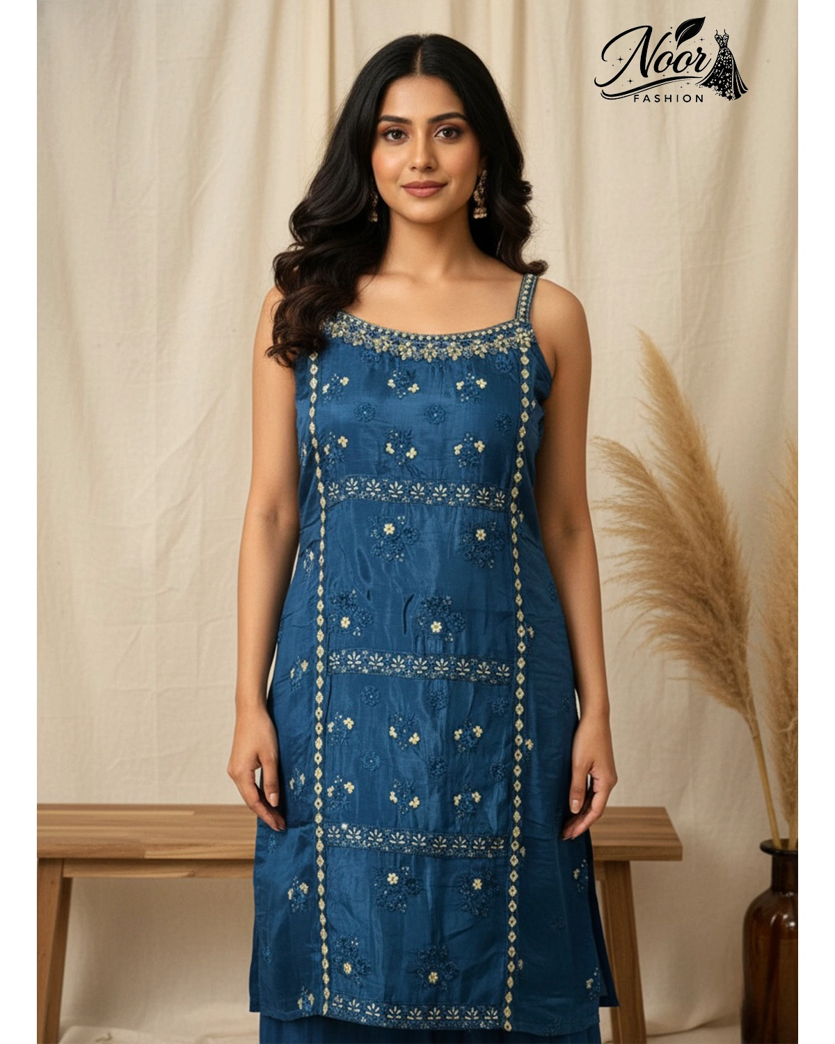 Elevate this look with statement silver or pearl Jhumkas and a delicate choker. Pair it with embellished metallic wedges or silver heels to enhance the length of the sharara. A soft, wavy hairstyle or a sleek high ponytail will perfectly complement the noodle-strap neckline.