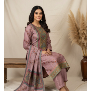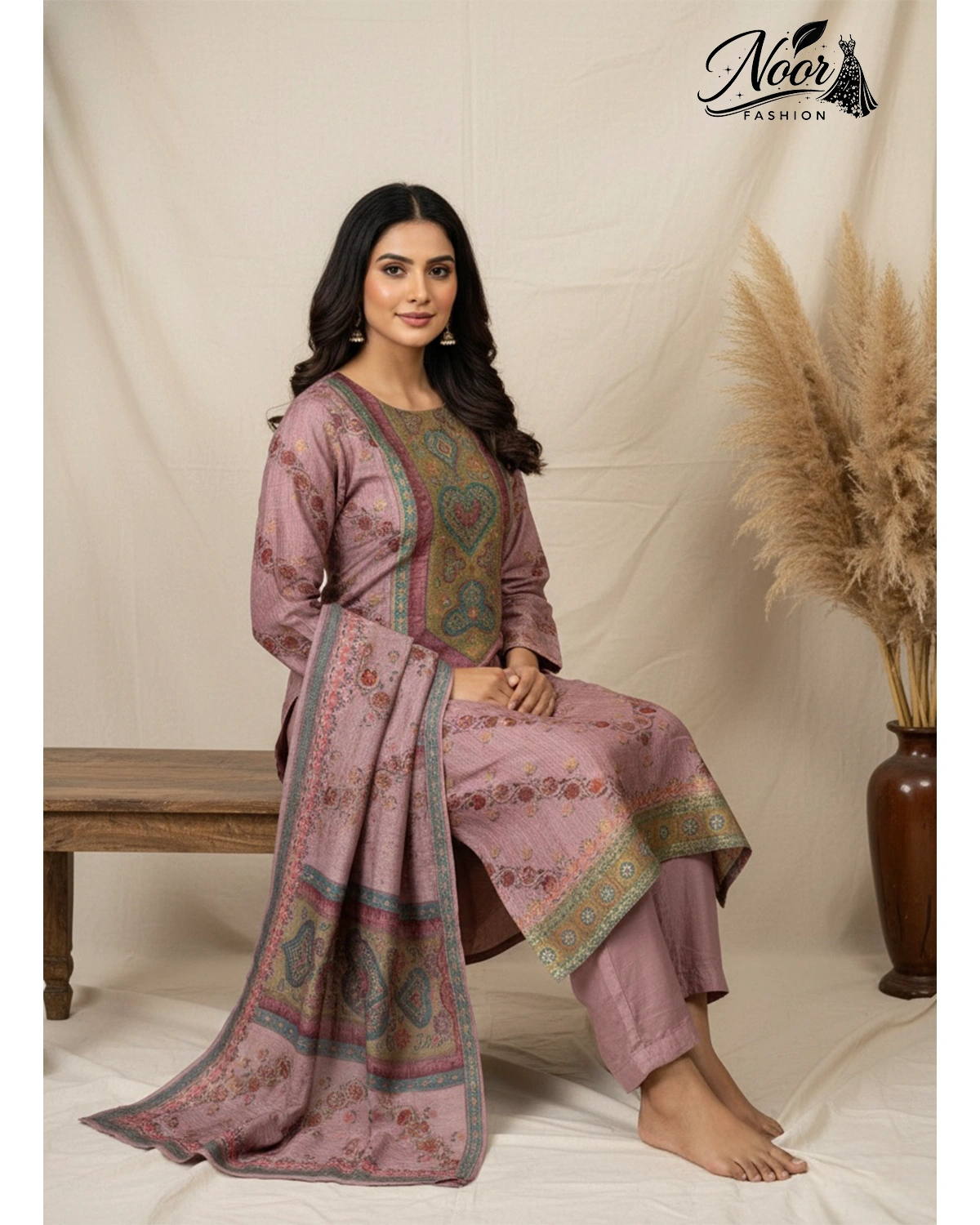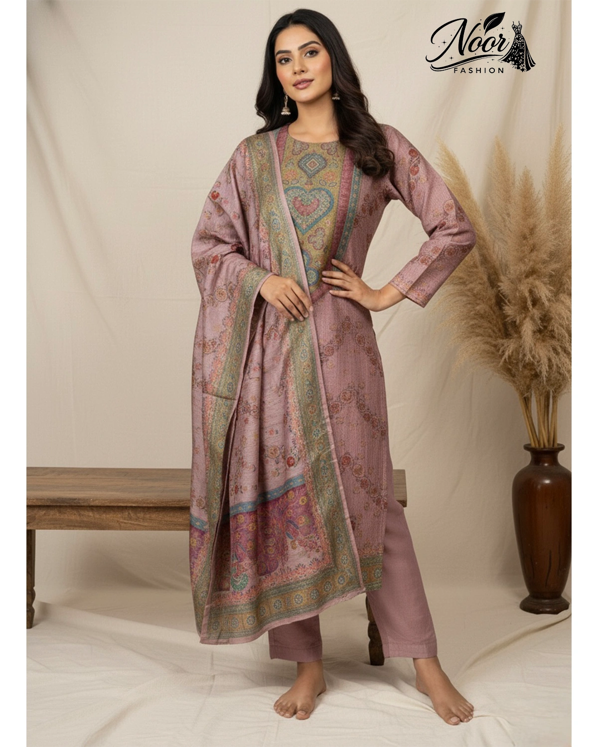 Elevate your ethnic repertoire with this breathtaking 3-piece Dola Silk ensemble. A perfect harmony of soft mauve hues and intricate positioned prints, this set is designed for the woman who seeks sophisticated charm and artisanal excellence. The natural luster of the Dola silk combined with subtle hand-touch detailing creates a look that is both regal and contemporary.