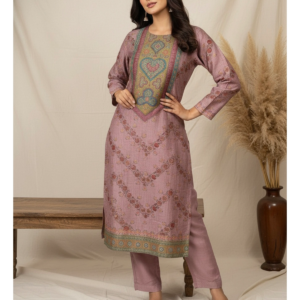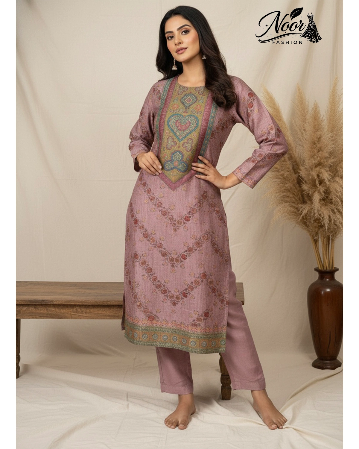 • The Pants: Tailored in a matching mauve hue, these straight-cut trousers offer a clean, minimalist contrast to the detailed kurti, ensuring a balanced and elongated silhouette.