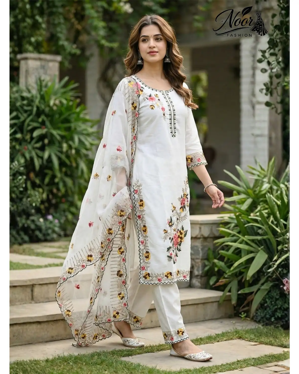 Designer Dupatta: The look is completed with a sheer, ethereal dupatta featuring scalloped borders adorned with matching floral embroidery. It adds a layer of romanticism and grace to the structured kurta.
