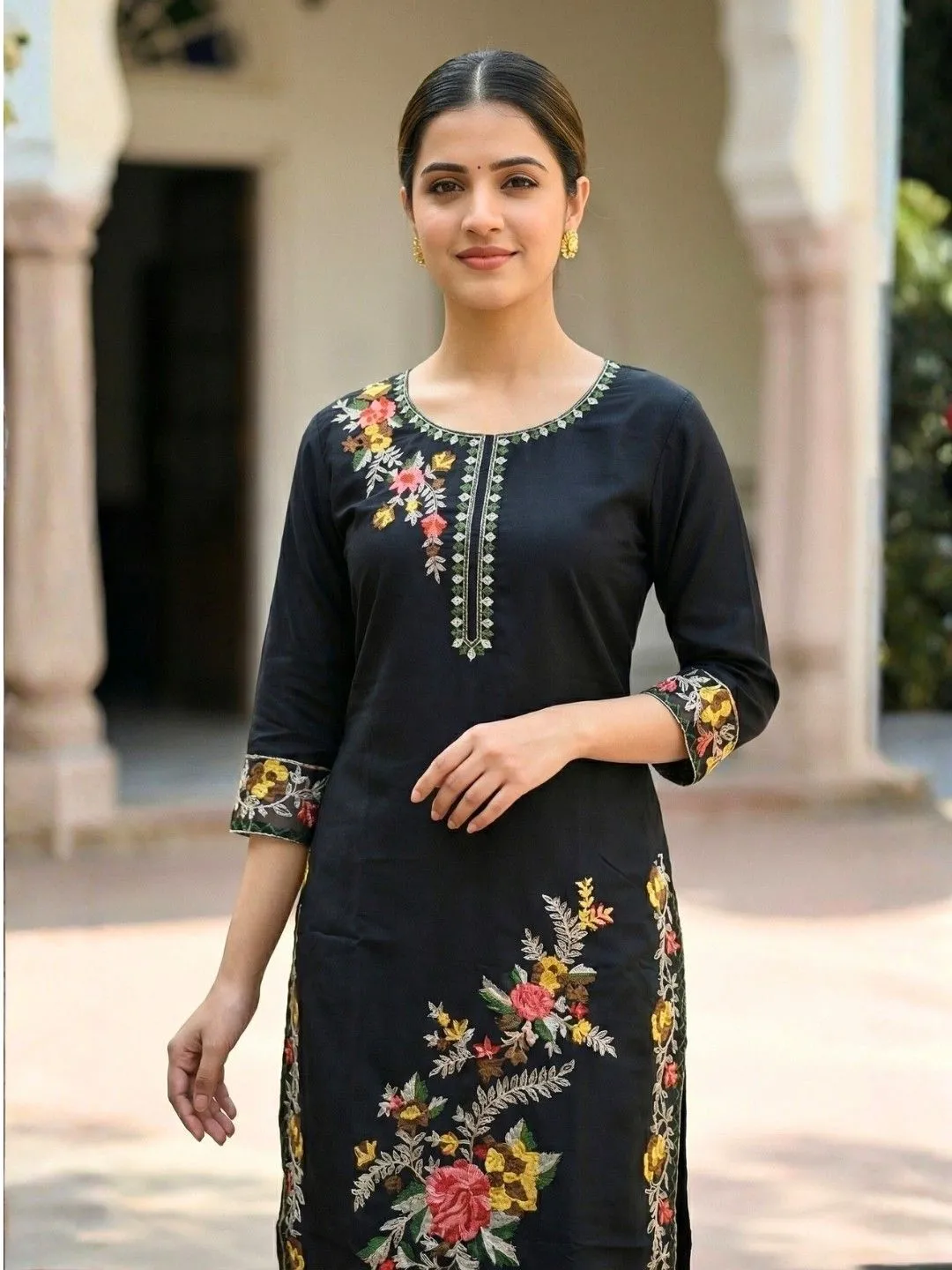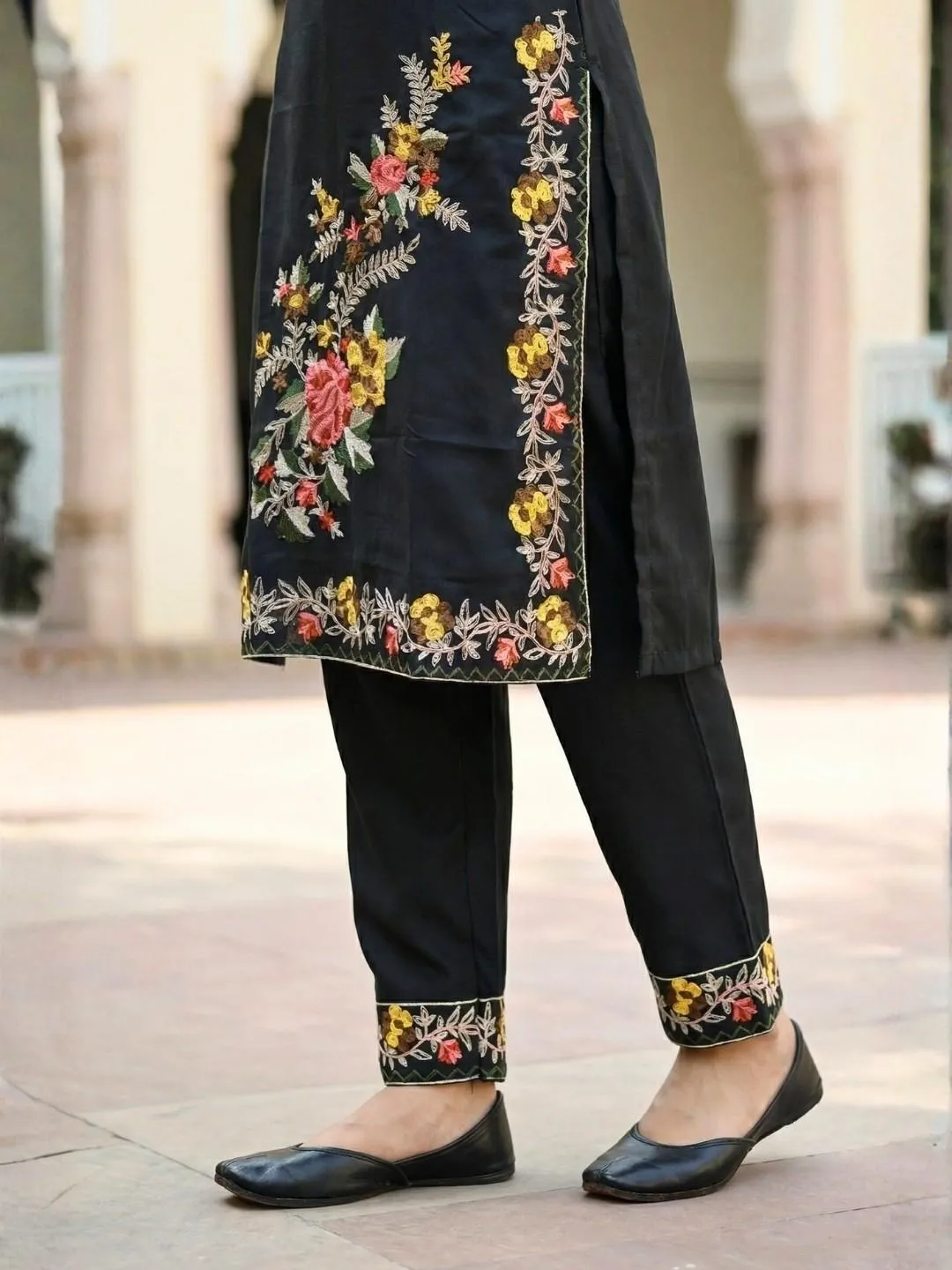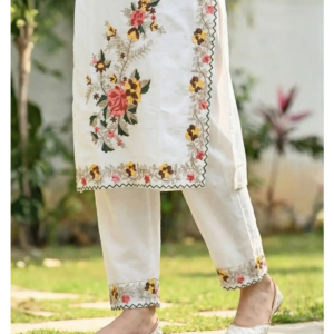 Coordinated Bottoms: The straight-cut pants are not left as an afterthought; they feature matching embroidered hems, tying the entire 3-piece look together seamlessly.