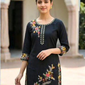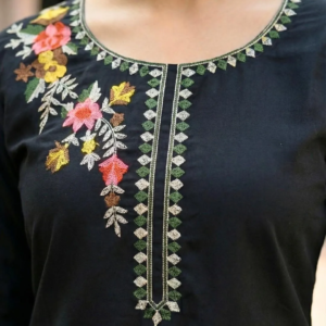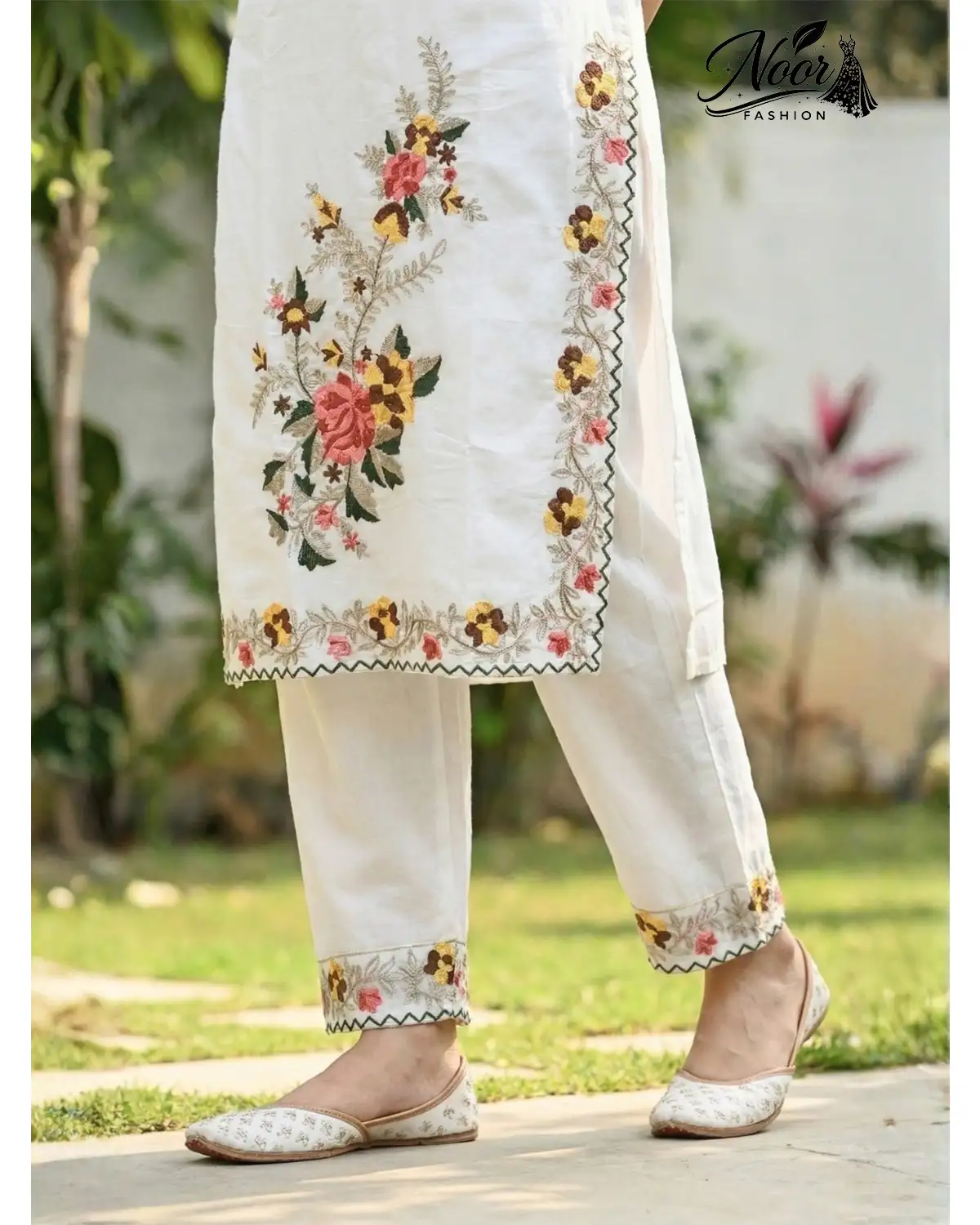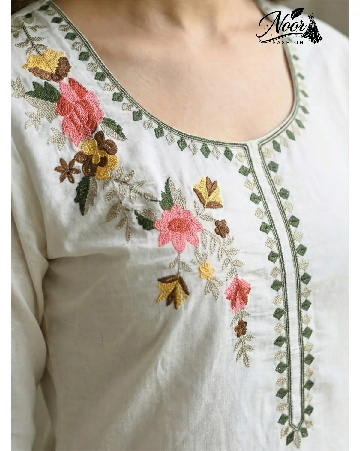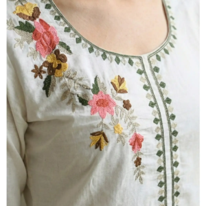 Floral Artistry: As seen in the close-up images, the kurta features vibrant floral motifs in hues of blush pink, sunny yellow, and earth-toned leaves. The embroidery is strategically placed on the shoulder and cascades gently, mimicking wildflowers growing in nature.