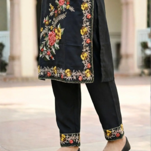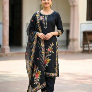 Step into elegance with the Enchanted Meadow Roman Silk Suit. Premium 3-piece set featuring exquisite floral embroidery. Available in Ivory & Black. Shop now!