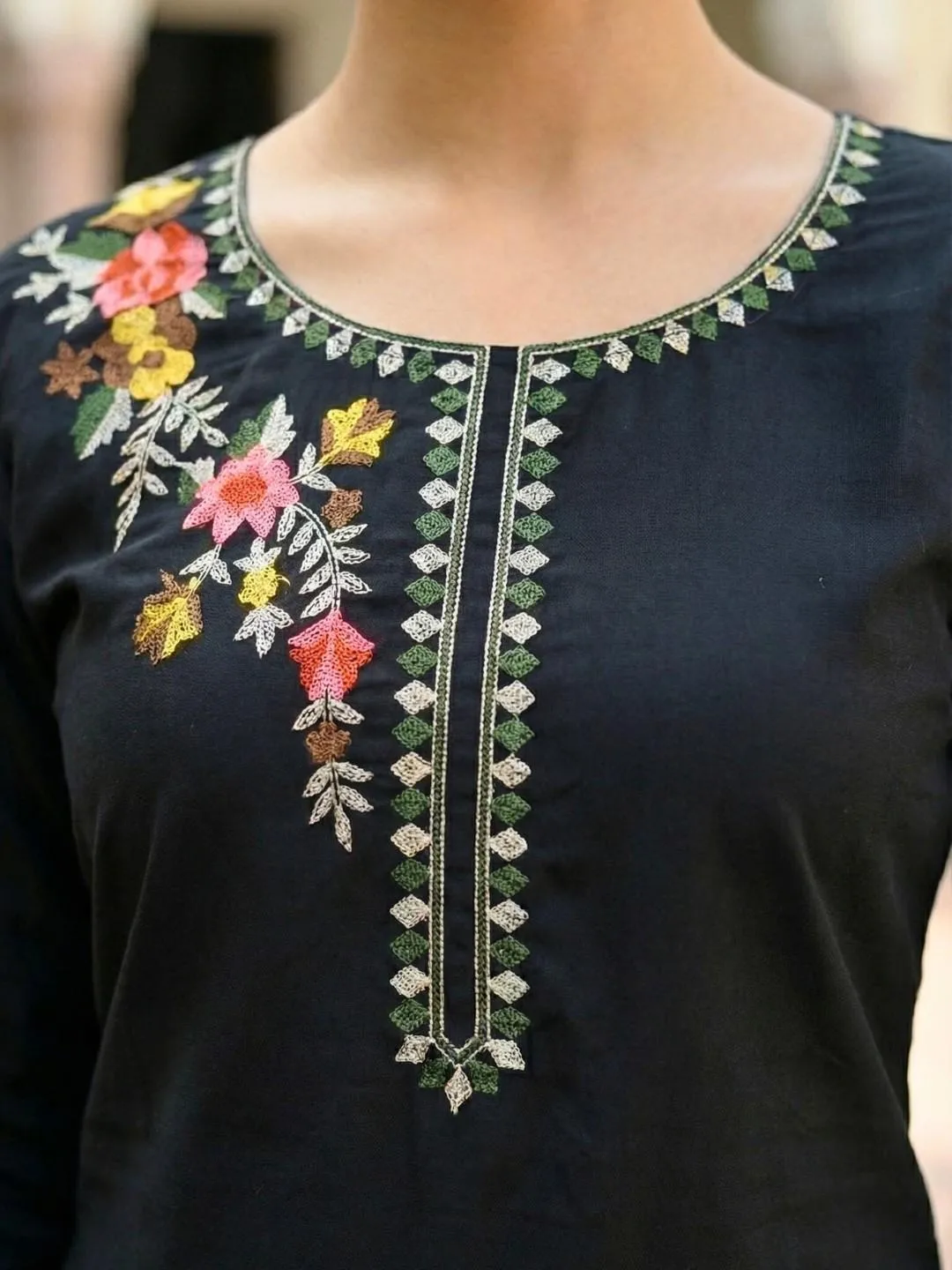 Detailed Neckline: The neckline is accentuated with a central placket featuring geometric diamond patterns in contrasting green and silver threads, adding a structured element to the organic floral design.