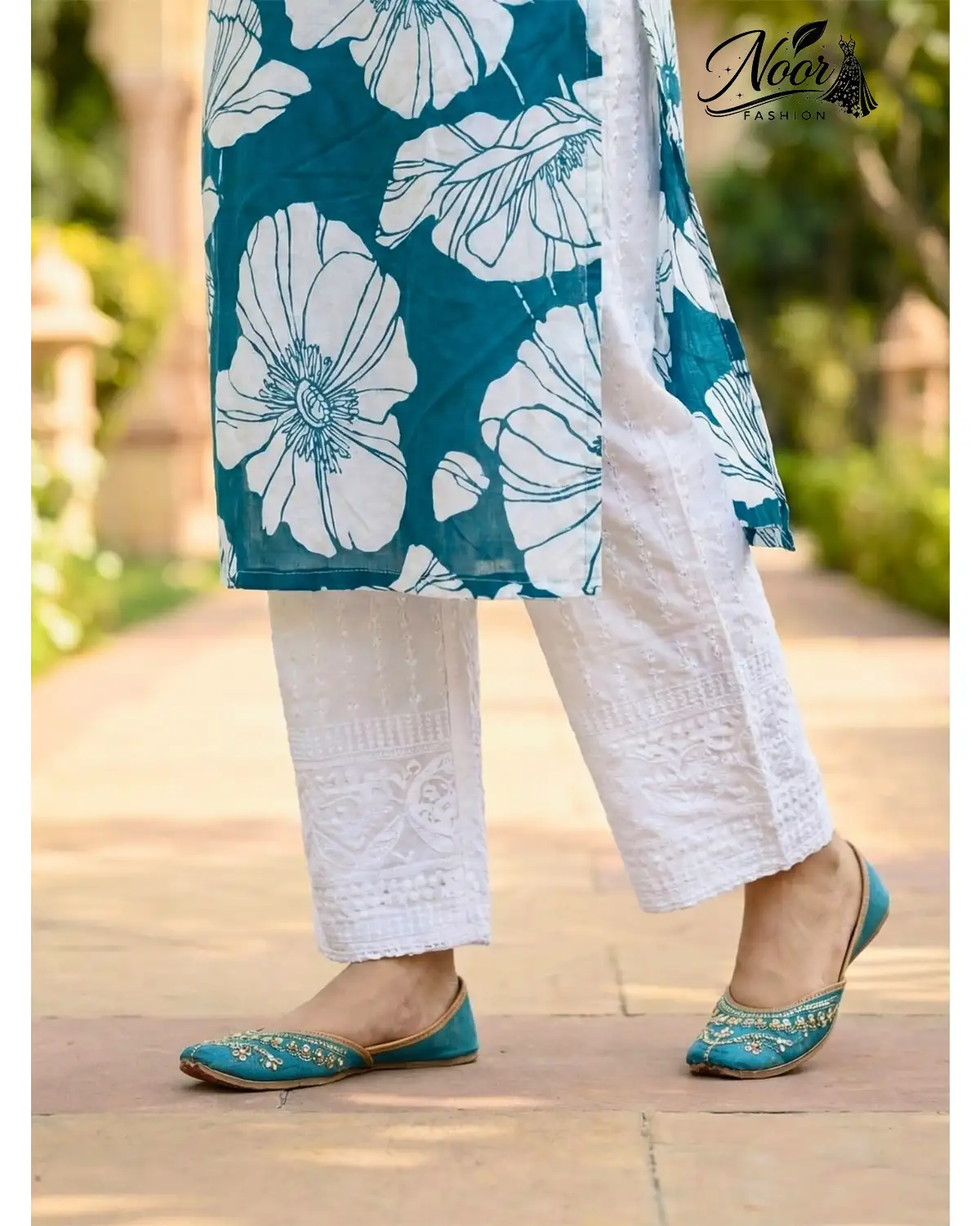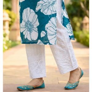 • Designer Bottoms: The star of this 3-piece set is undoubtedly the trousers. Unlike basic solids, these white pants feature exquisite Chikankari-style embroidery and scalloped detailing at the hem. This premium touch adds a layer of texture and luxury to the ensemble.