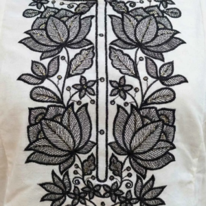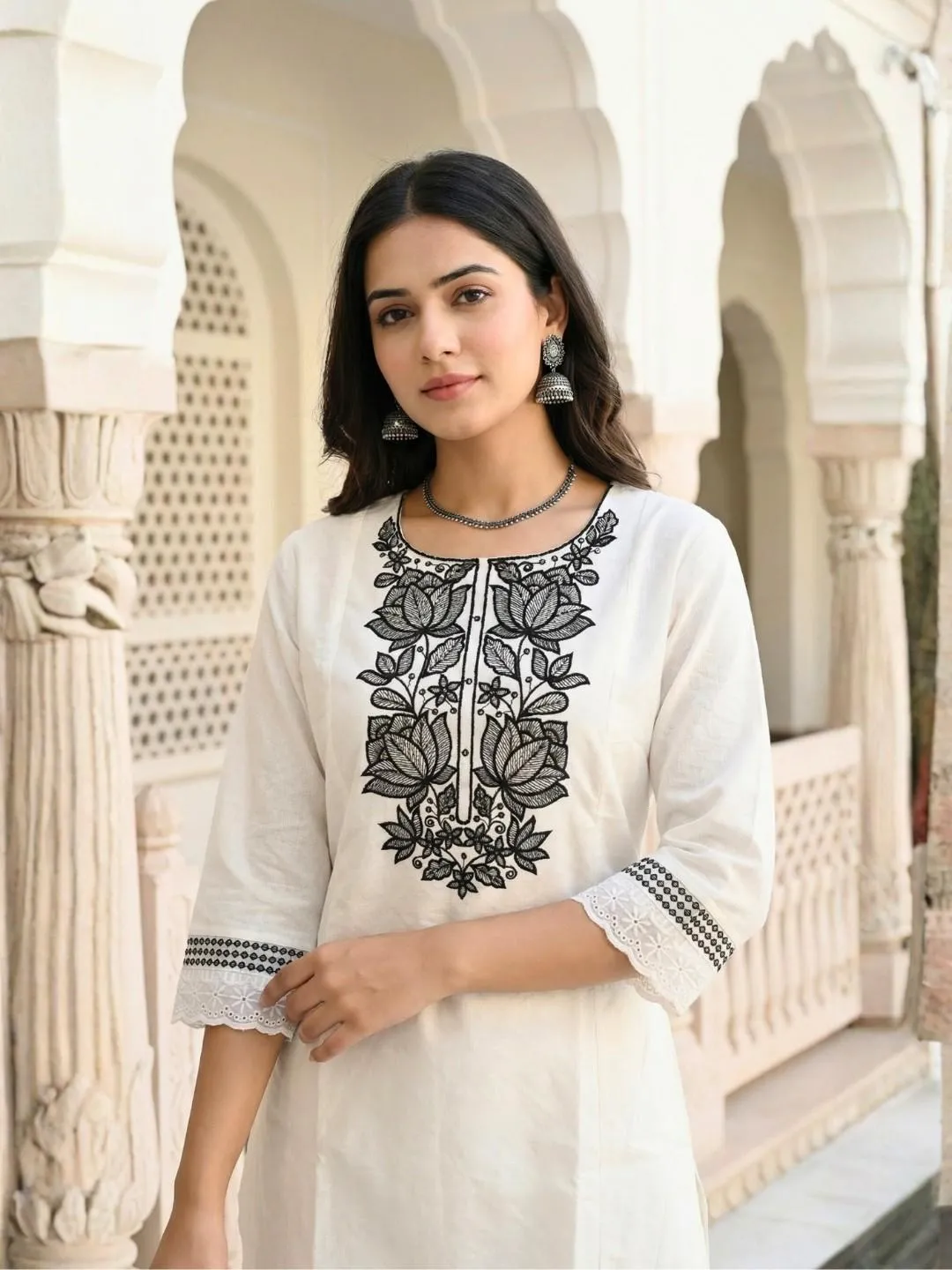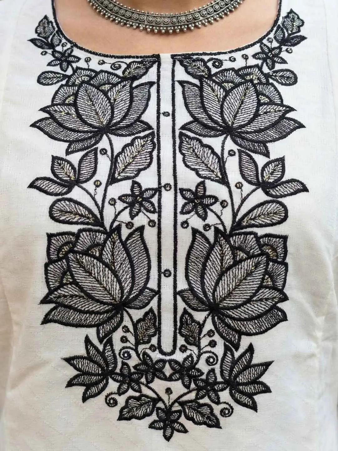 Statement Yoke Embroidery: As seen in the close-up images, the neckline is adorned with heavy, intricate black thread work. The design features bold lotus and floral motifs that rest elegantly against the white background, creating a captivating focal point.