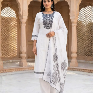 The Monochrome Muse Cotton Suit (SKU: NF997255) is a celebration of the timeless black-and-white palette, designed for the modern woman who believes that true style whispers rather than shouts. In a fashion world often dominated by loud colors, this pristine Off-White ensemble stands out with its poise and polished charm. Whether you are heading to a corporate meeting, a casual brunch, or a serene evening gathering, this suit promises to keep you looking fresh, composed, and effortlessly chic.