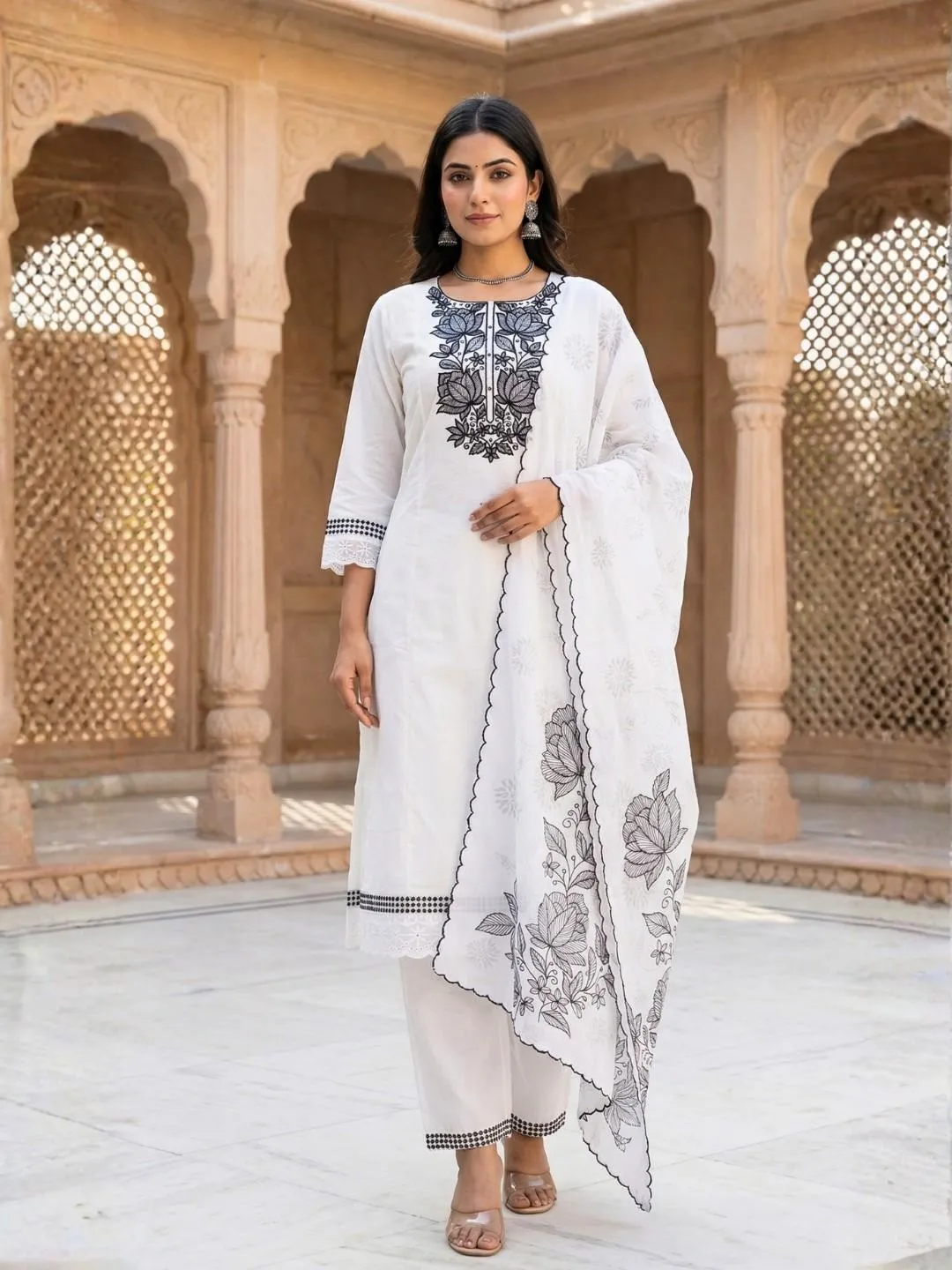 Redefine simplicity with the Monochrome Muse Cotton Suit. A premium off-white 3-piece set featuring chic black floral embroidery. Shop the limited look now!