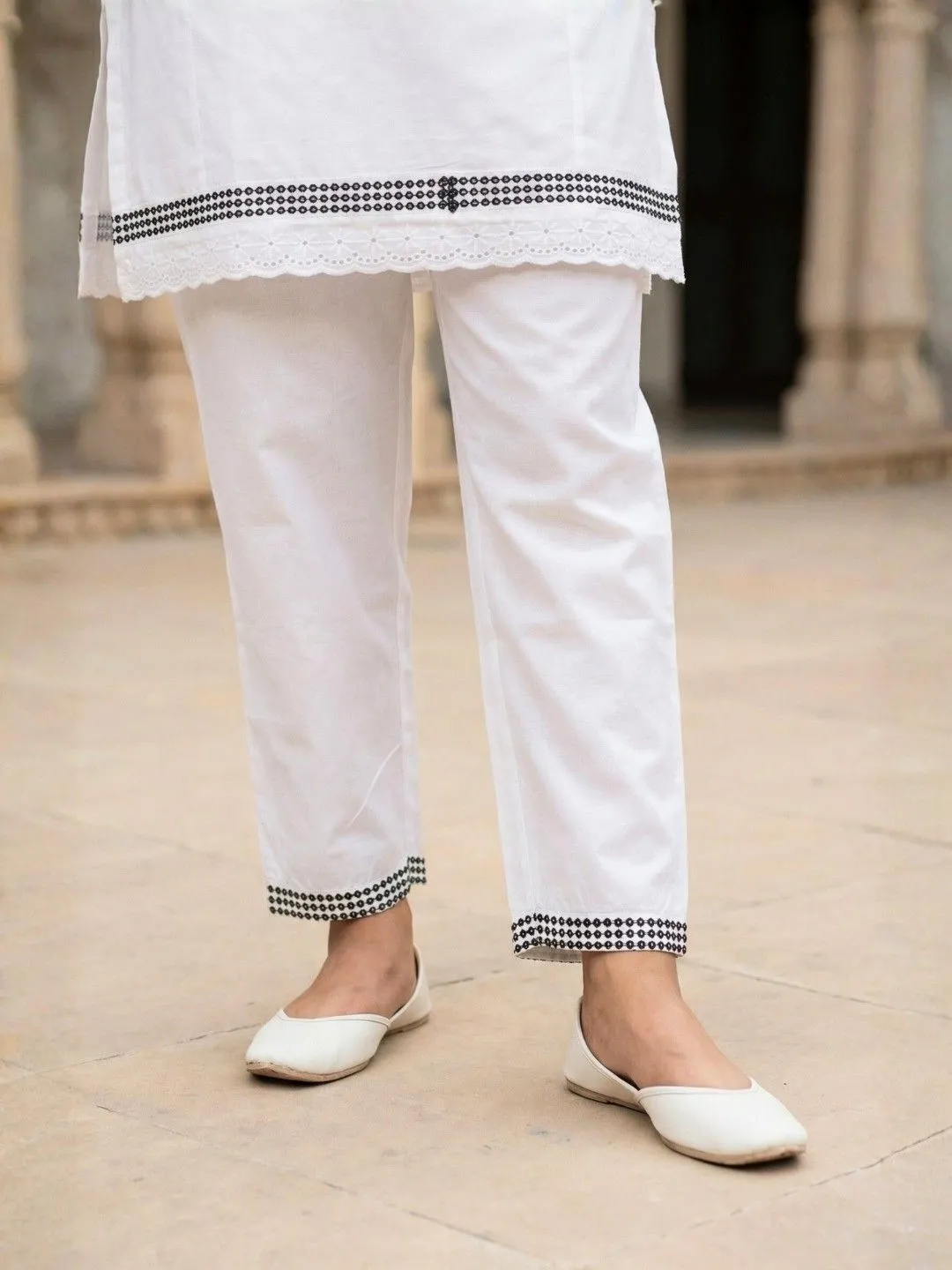 Chic Bottoms: The straight-cut pants are not just a basic addition; they feature a distinct black geometric lace border at the ankle, tying the entire monochrome look together seamlessly.
