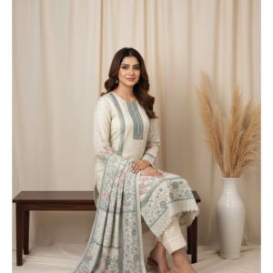 A perfect harmony of traditional aesthetics and contemporary flair, this cream-colored muslin suit is a testament to refined elegance. Featuring a sophisticated palette accented by delicate pink florals and cool teal prints, this set is designed to make a lasting impression at any gathering.