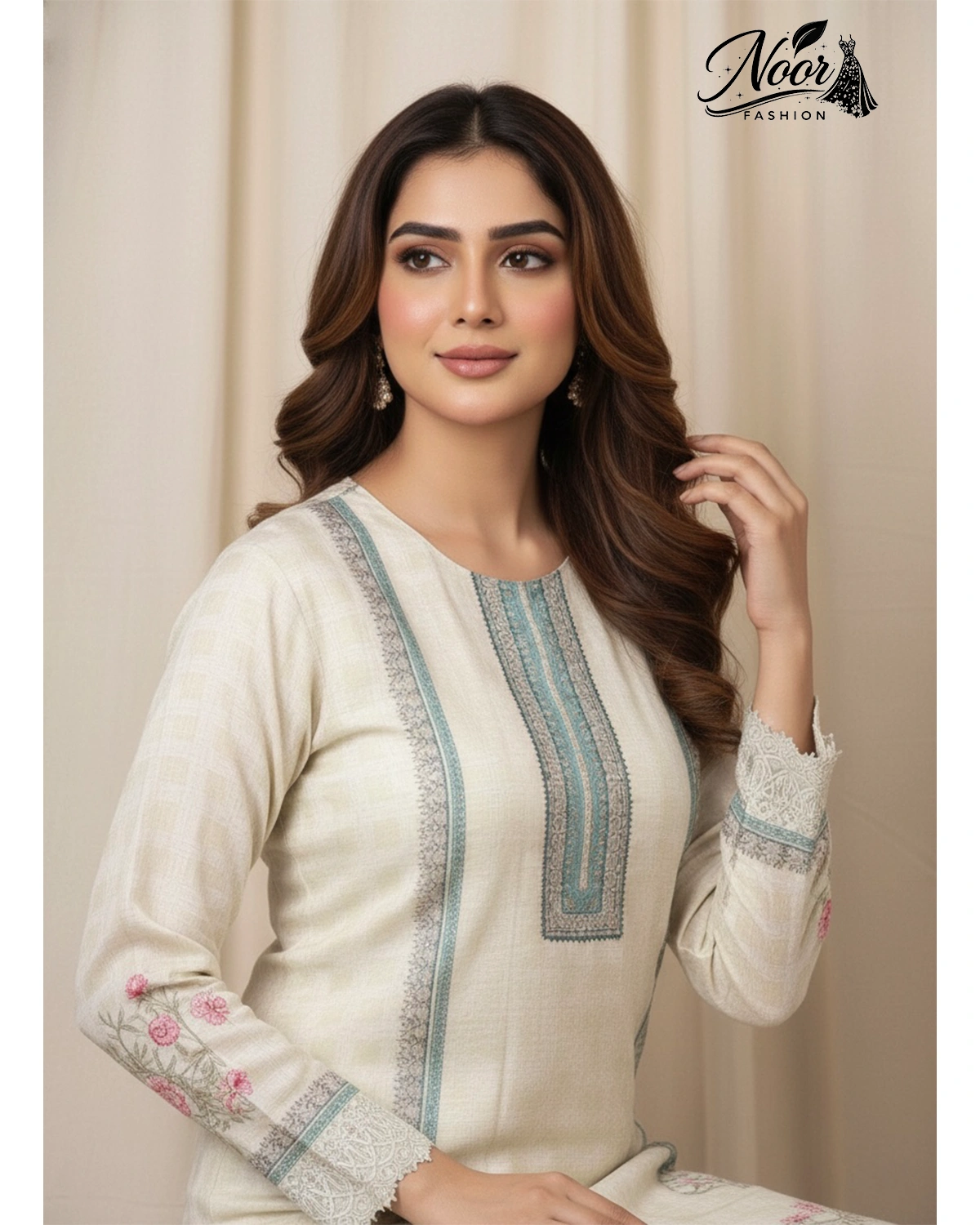 The Pants: Included are matching cream trousers tailored in a sleek, straight-fit cut. The fabric offers a subtle sheen that complements the kurti perfectly while ensuring all-day comfort.