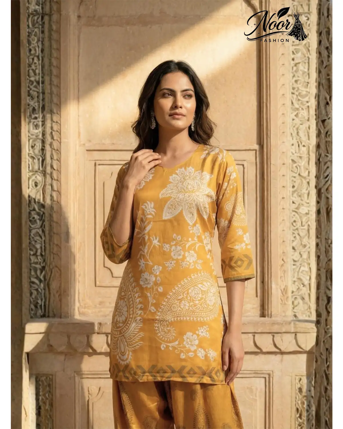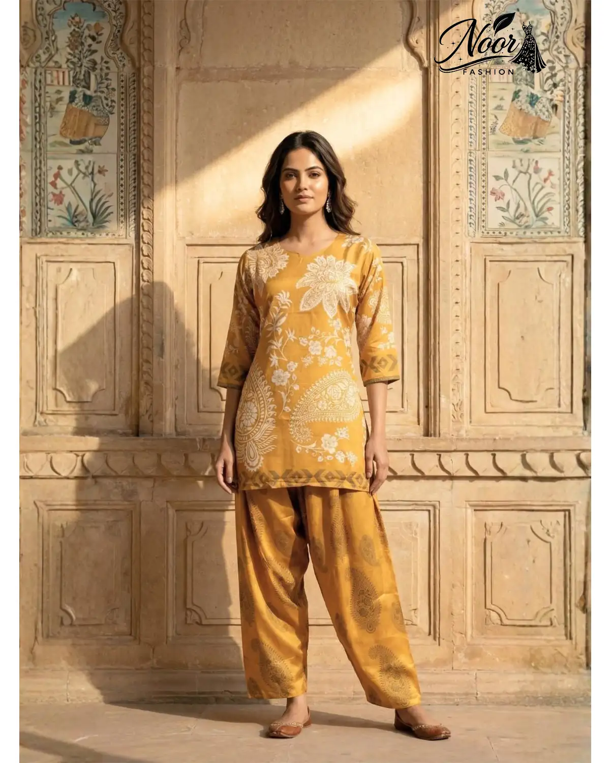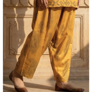 Embrace golden elegance with the Mustard Paisley Silk Co-Ord. This luxury 2-piece set features intricate prints and a comfortable salwar fit. Shop now!