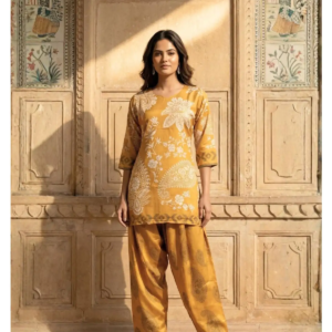 Salwar-Style Bottoms: Unlike standard straight pants, this co-ord comes with traditional Salwar-style bottoms. They are pleated and roomy at the hips and tapered at the ankles, offering unmatched comfort and a unique retro-chic look.