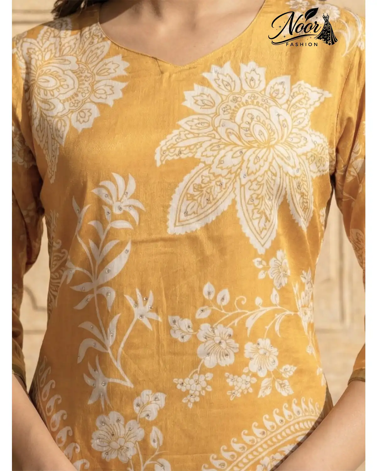 Classic Paisley Motifs: The tunic features large, artistic white paisley and floral motifs that contrast beautifully against the golden background. As seen in the close-up shots, these motifs are highlighted with subtle, scattered sequins that add a hint of festive sparkle.