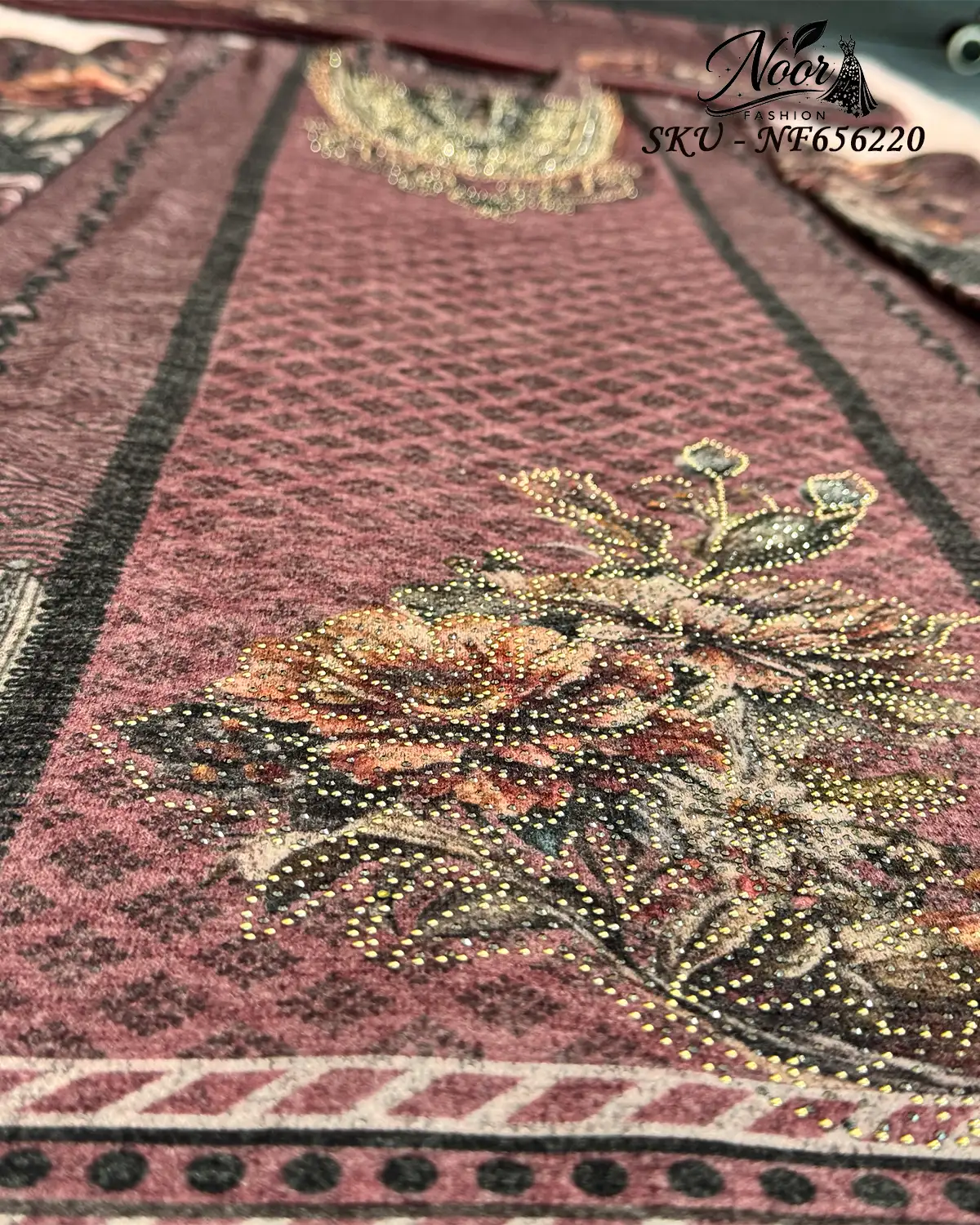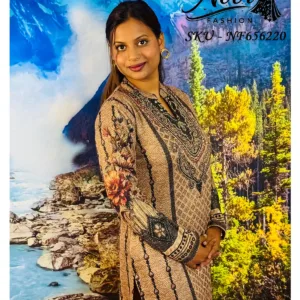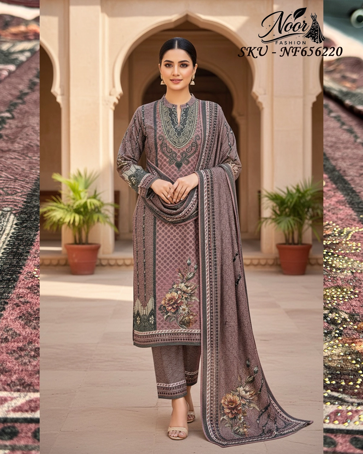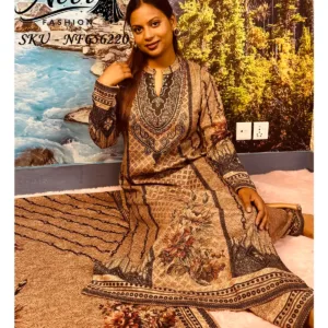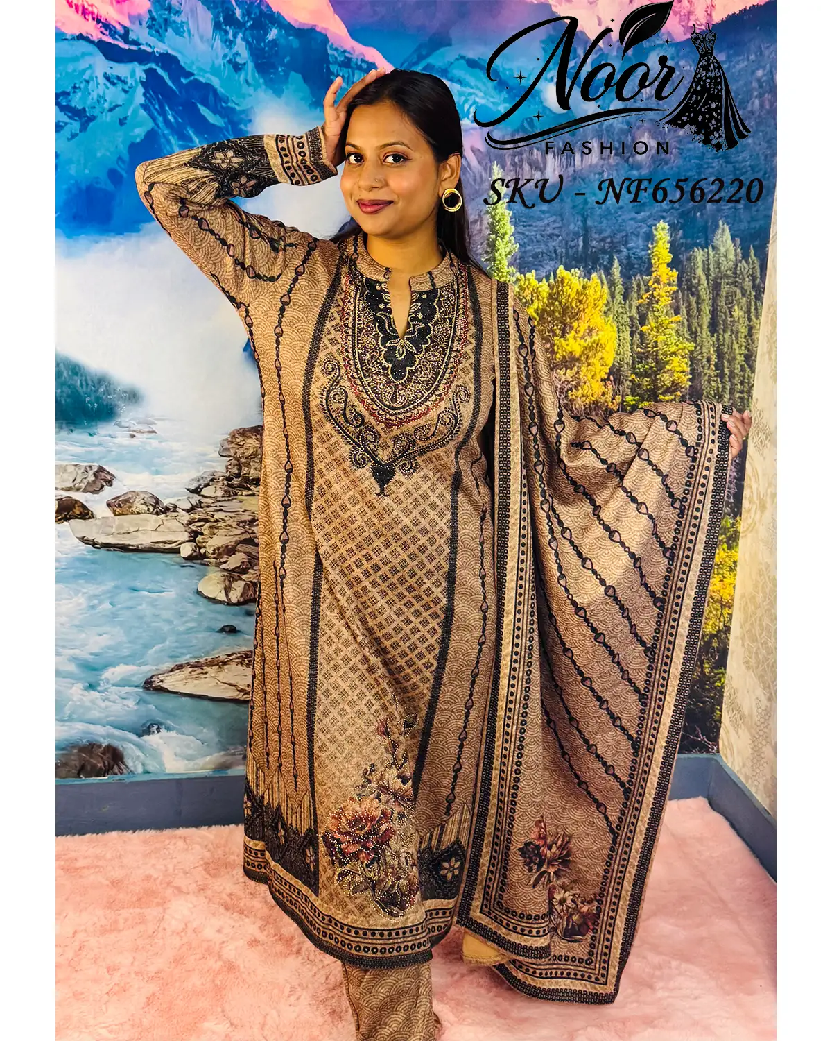 Elegant pashmina Karachi print 3-piece suit designed for warmth and everyday comfort, featuring rich traditional patterns and a distinct net neckline with shurushki work.