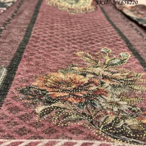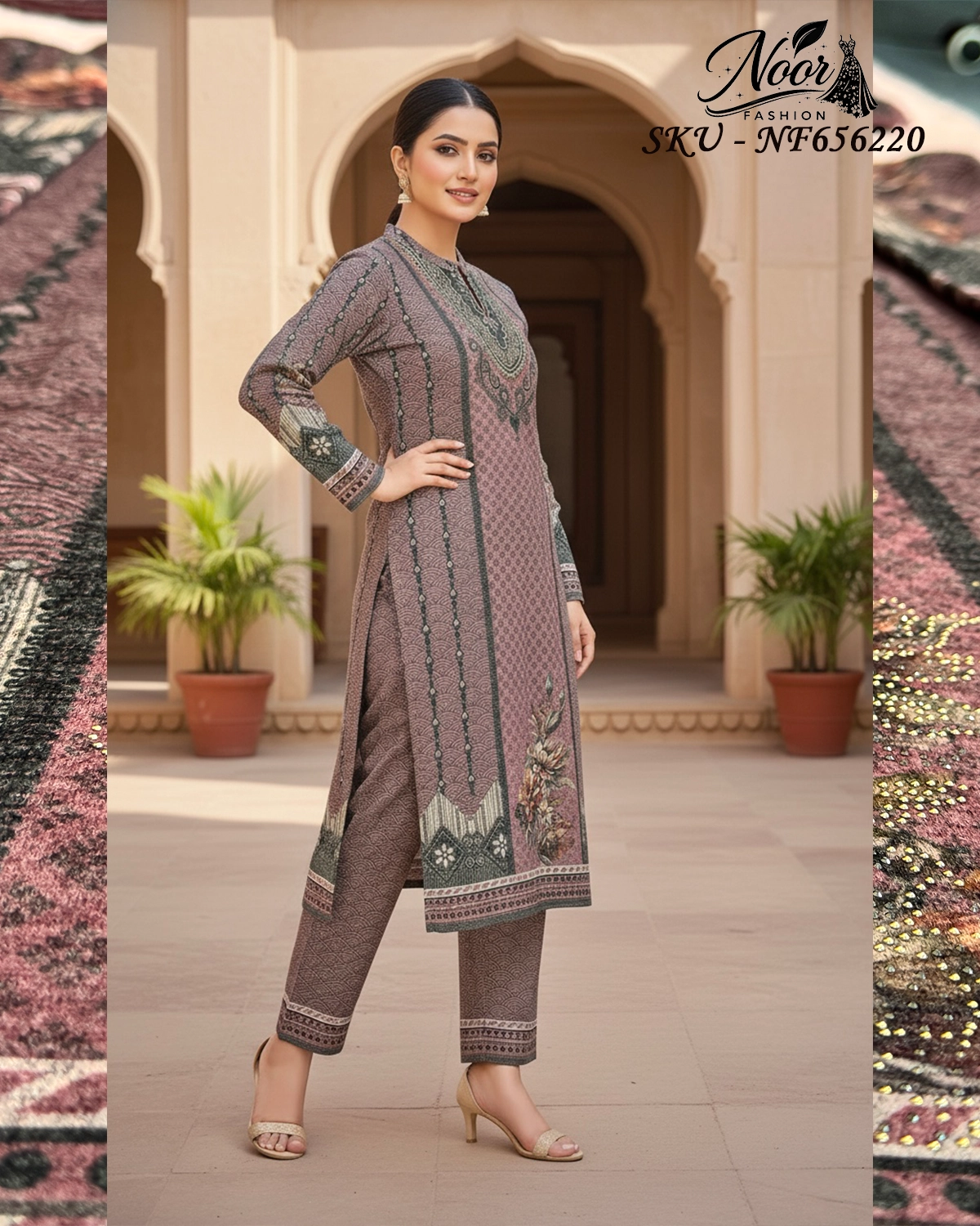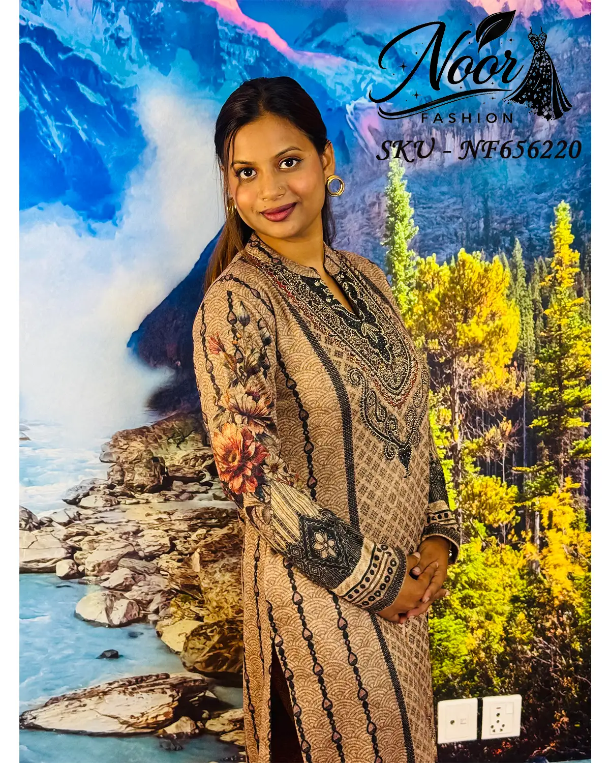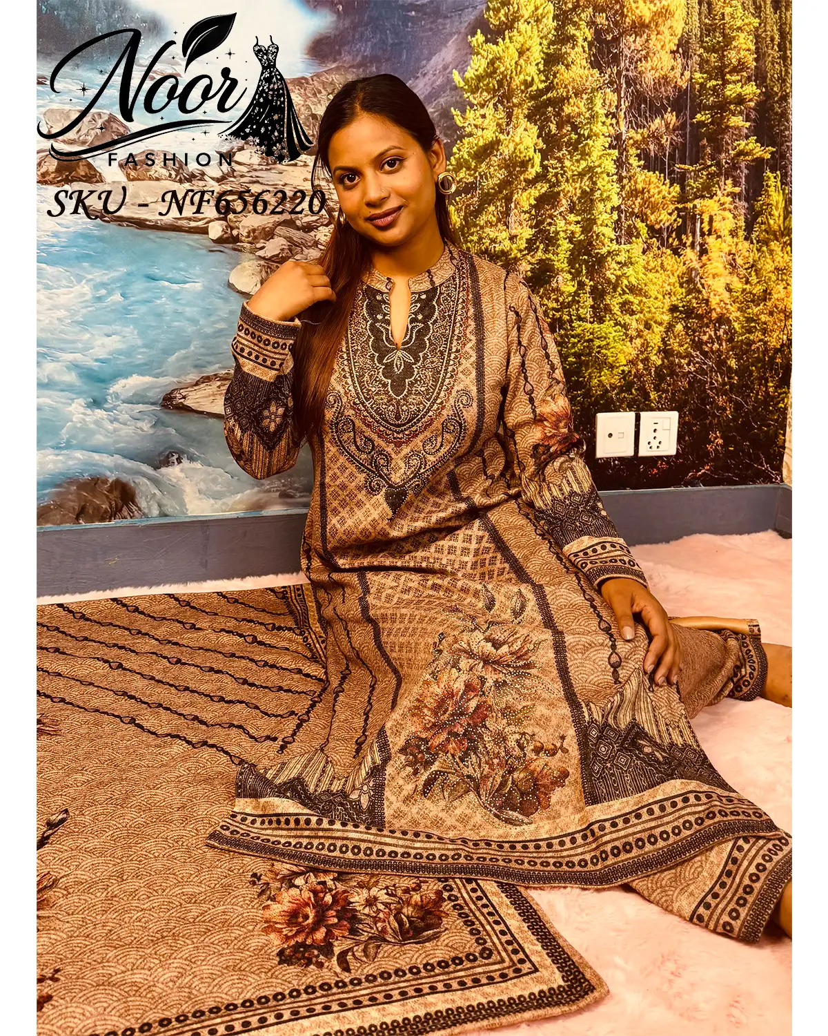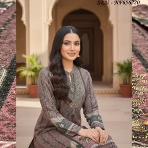 Elegant pashmina Karachi print 3-piece suit designed for warmth and everyday comfort, featuring rich traditional patterns and a distinct net neckline with shurushki work.