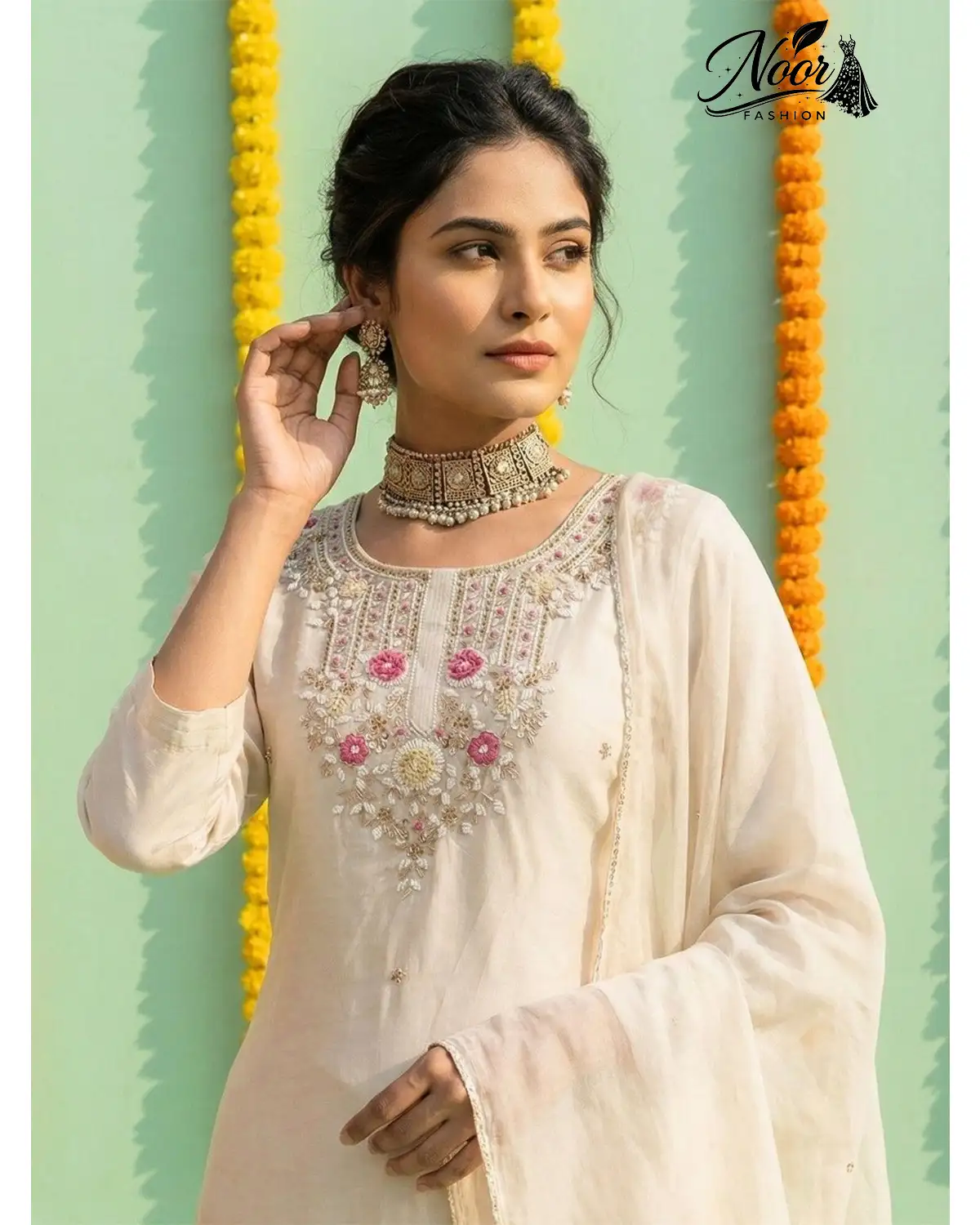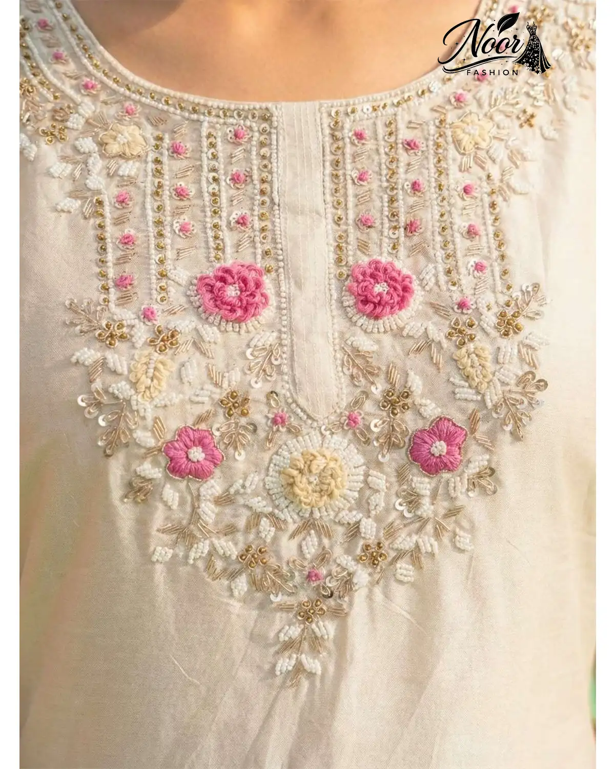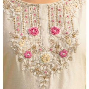 Floral Hand Embroidery: The neckline is the focal point, adorned with a mesmerizing arrangement of 3D floral motifs. Soft pink thread work creates blooming flowers, accented with delicate white beads and hints of gold Zari. This “Pearl Bloom” design mimics the freshness of spring.