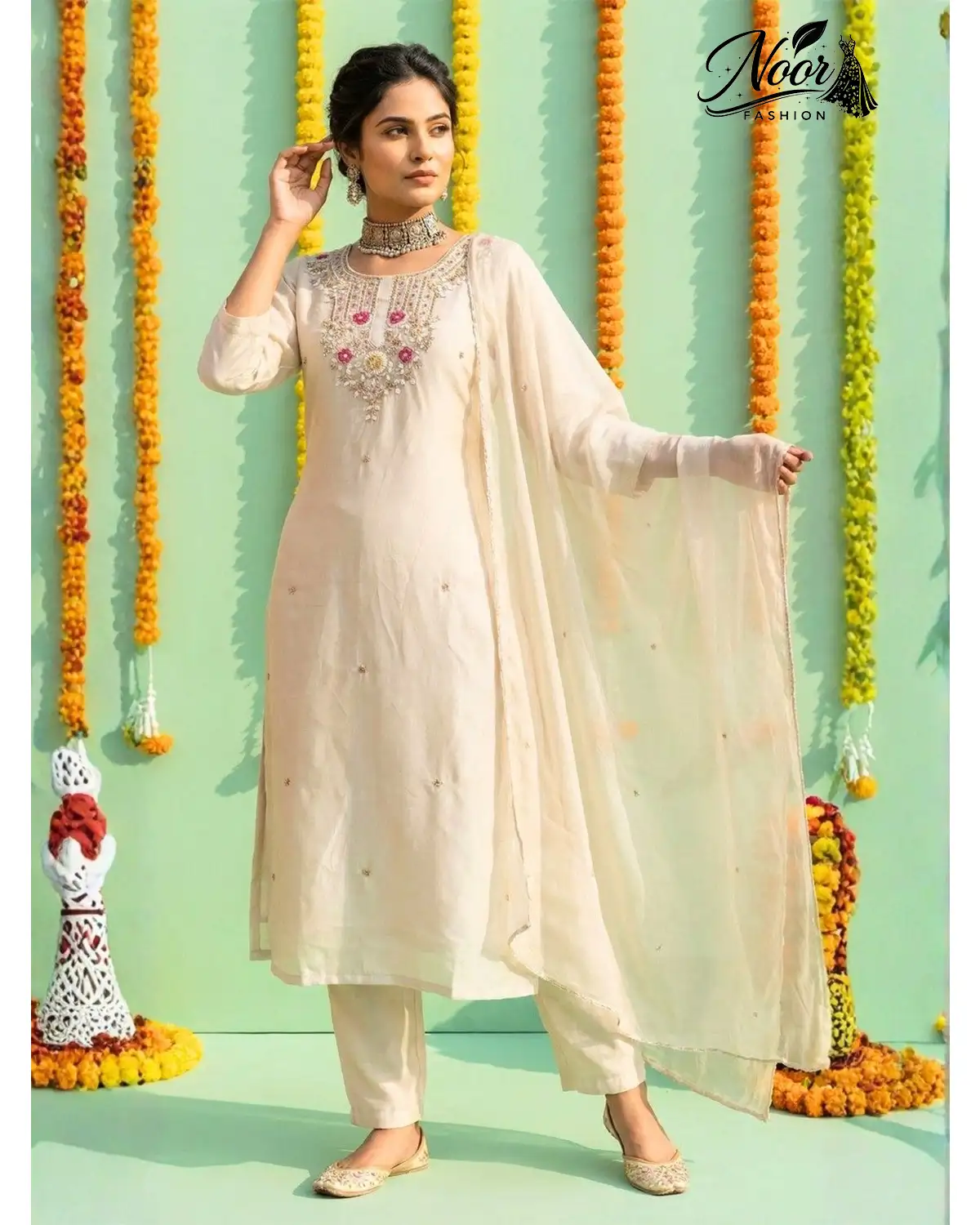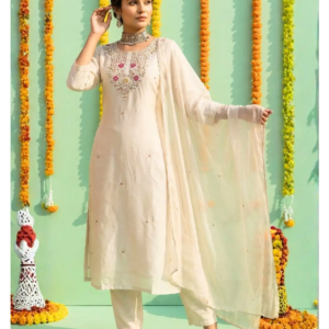 The Pearl Bloom Raw Silk Suit (SKU: NF381339) is a testament to the beauty of understated elegance. Designed for the sophisticated woman who prefers grace over glitter, this ensemble captures the serenity of a blooming garden in a timeless Off-White palette. Whether you are gracing a daytime wedding, a festive puja, or an elegant family gathering, this suit promises to envelop you in an aura of royalty and poise.