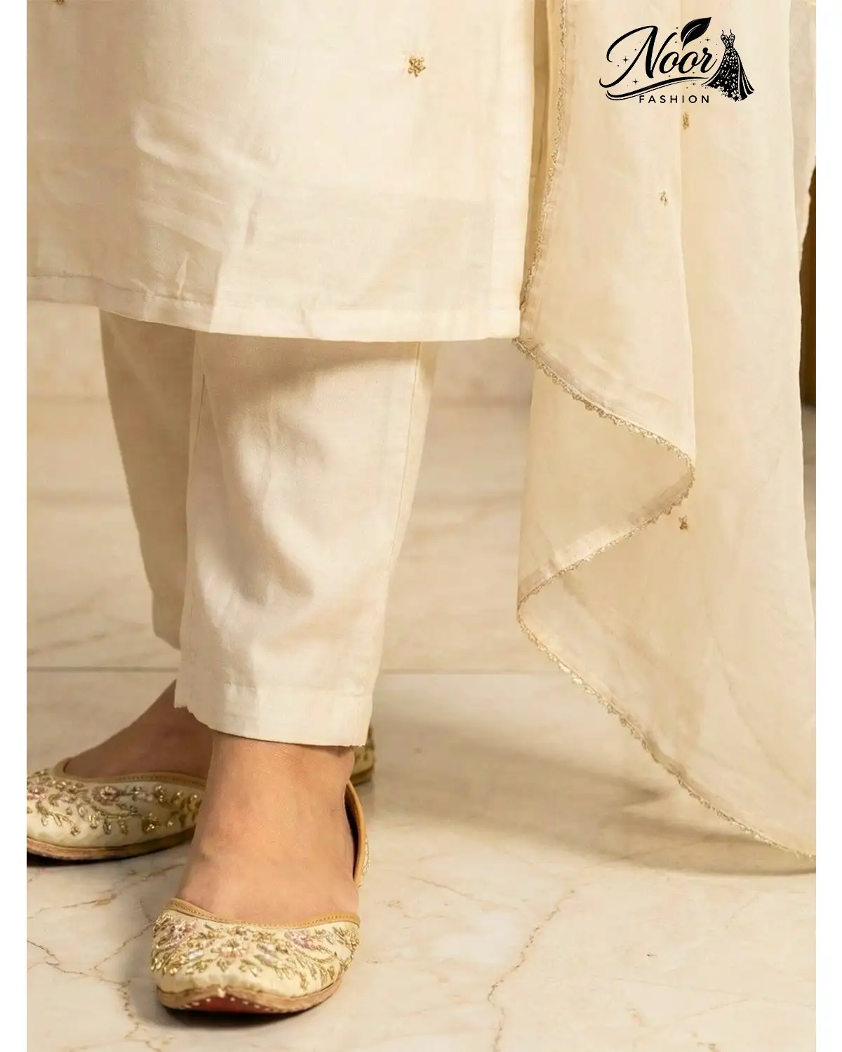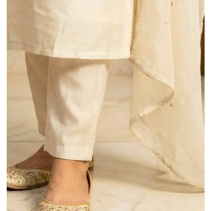 Elegant Bottoms: The straight-cut pants in matching off-white fabric complete the monochromatic look, ensuring a seamless and height-enhancing appearance.