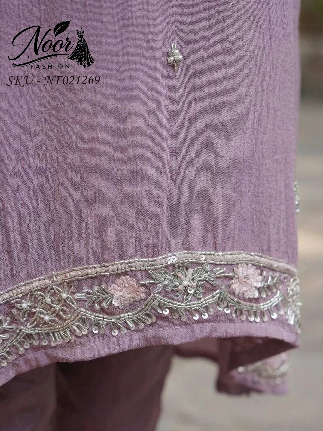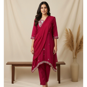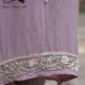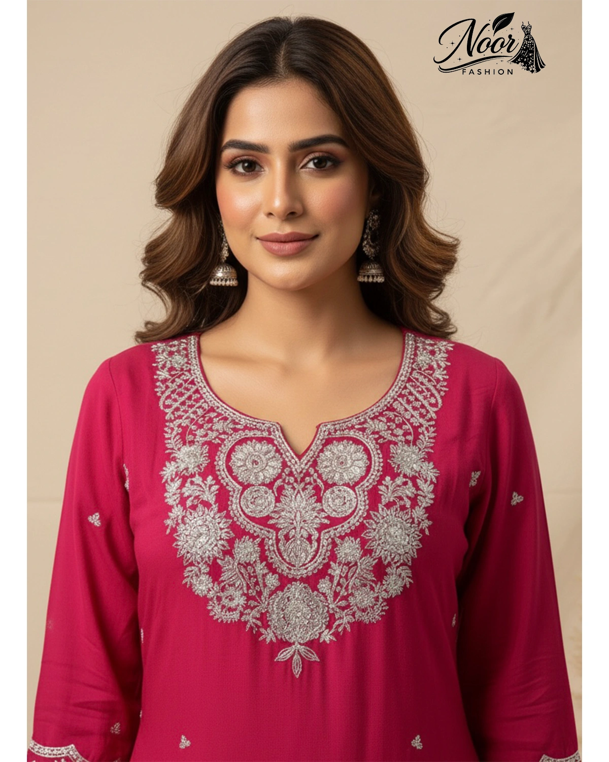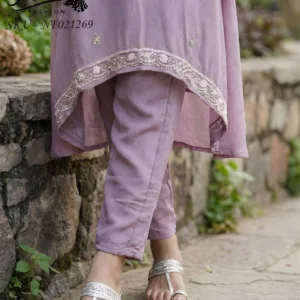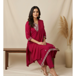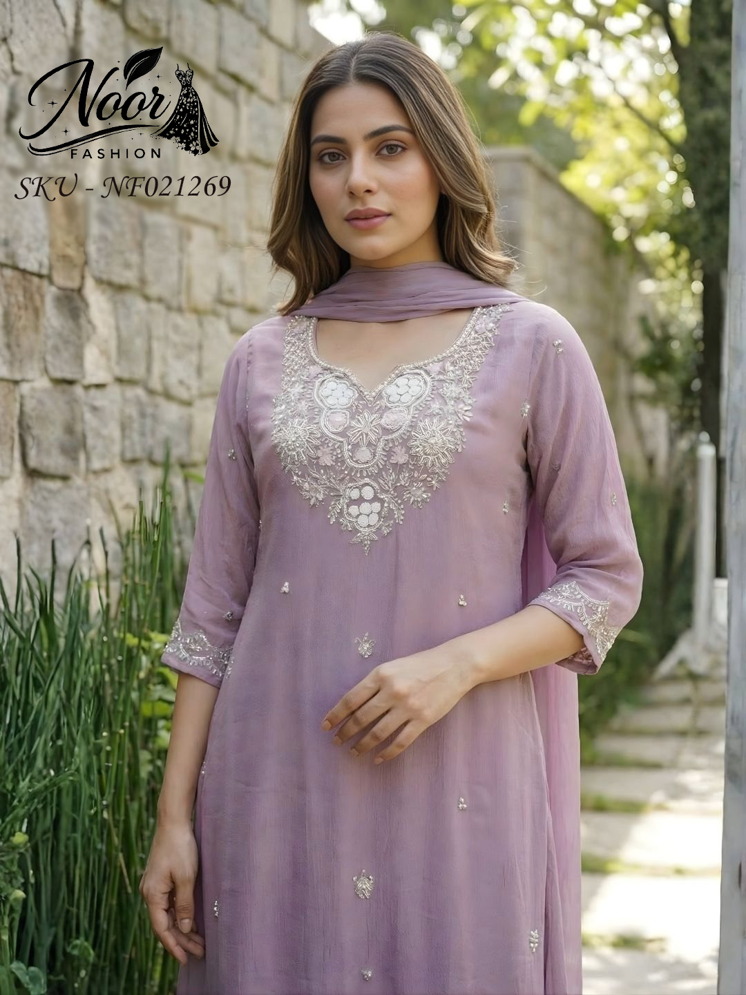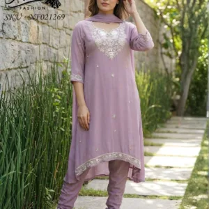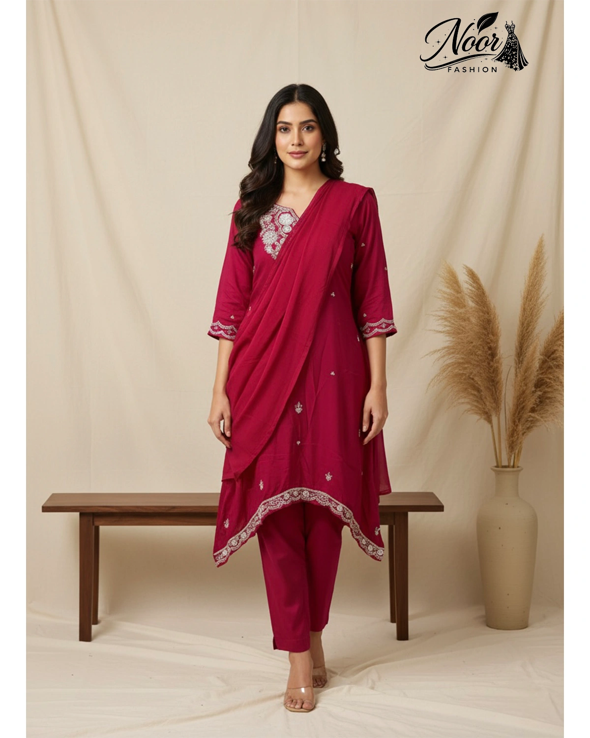 Step into elegance with this premium Chinon A-line C-cut 3-piece suit set. Designed with a flattering silhouette and graceful fall, this outfit delivers a luxurious look for special occasions. The soft Chinon fabric ensures comfort while maintaining a designer finish.