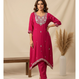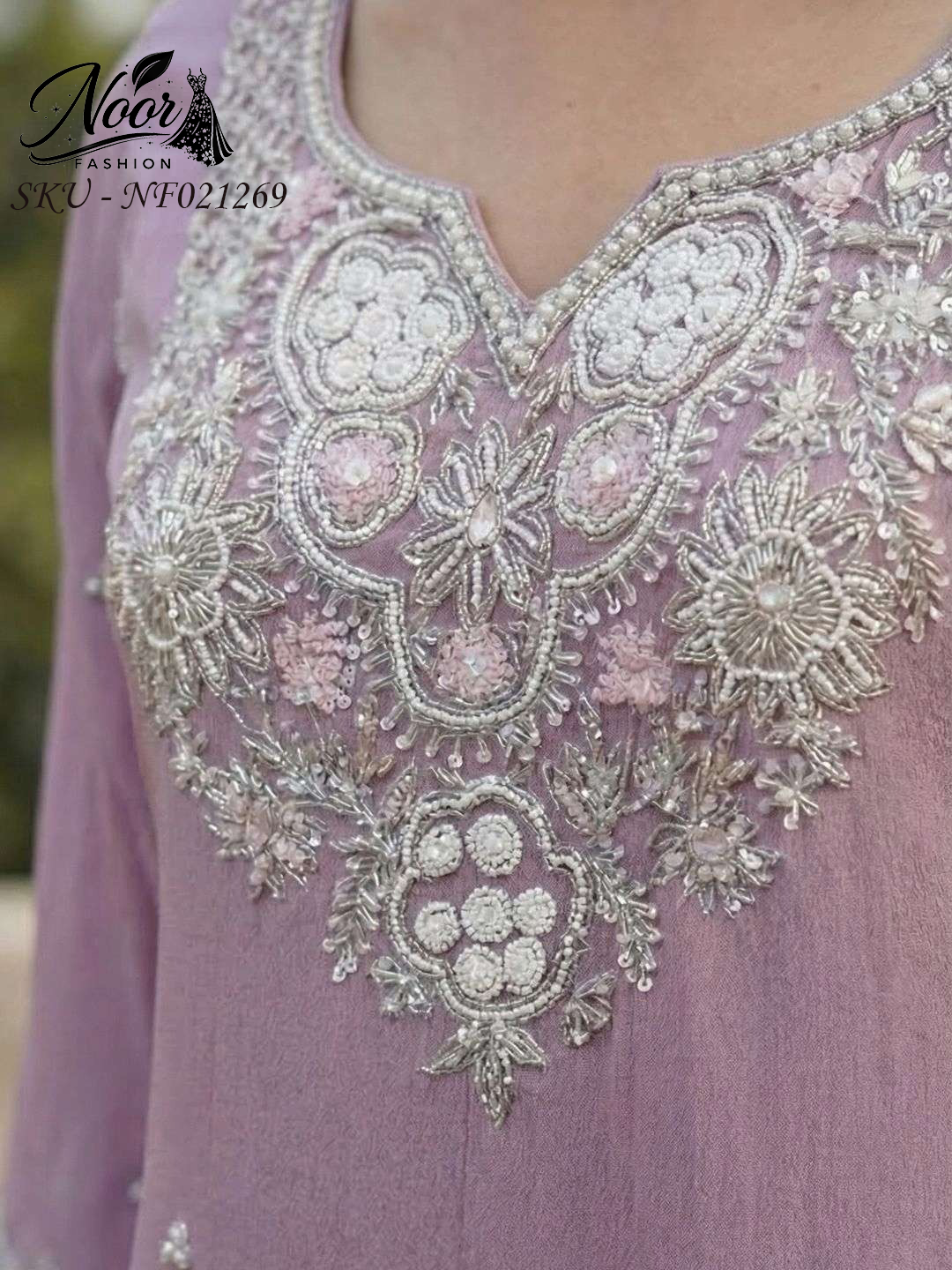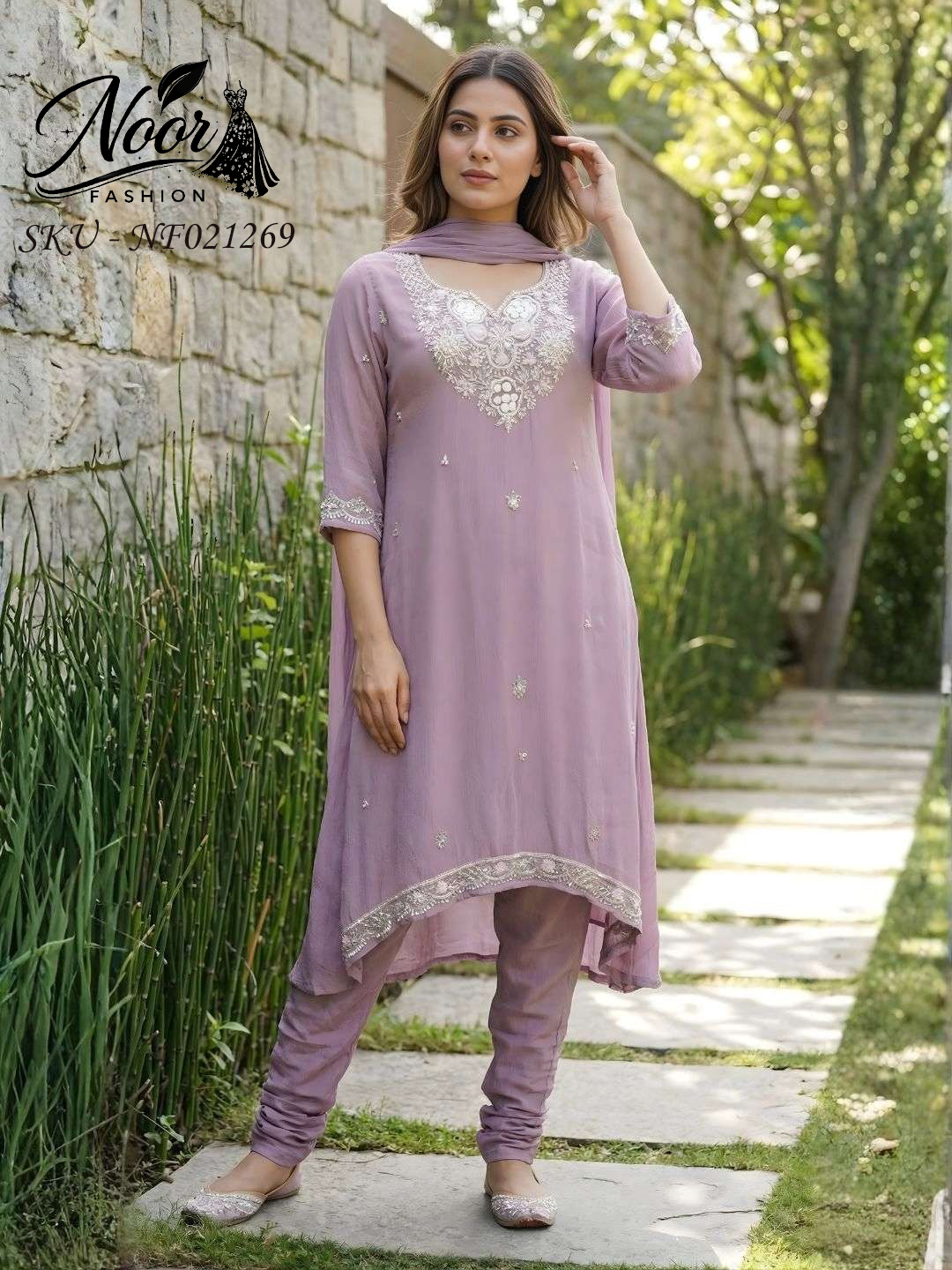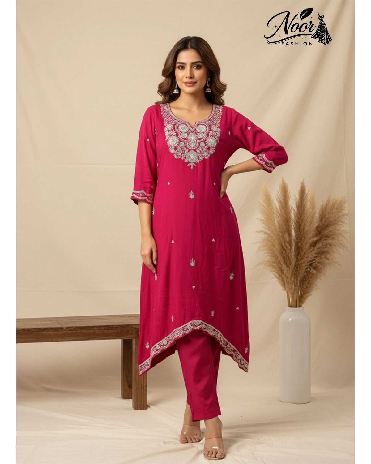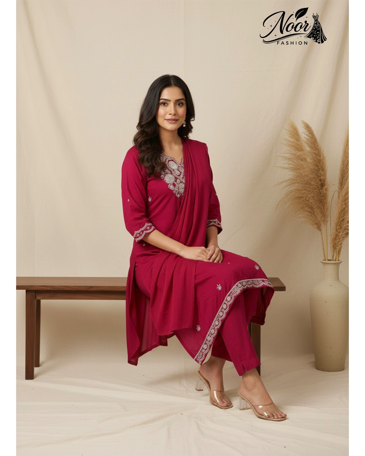 Step into elegance with this premium Chinon A-line C-cut 3-piece suit set. Designed with a flattering silhouette and graceful fall, this outfit delivers a luxurious look for special occasions. The soft Chinon fabric ensures comfort while maintaining a designer finish.