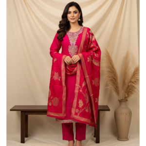 The Roman Silk All Over Zari Hand-Touch Work Suit Set in Radiant Magenta is a masterpiece designed for the woman who loves to make a statement. This three-piece ensemble combines the rich, lustrous texture of Roman silk with the majestic heritage of a Banarasi dupatta, ensuring you look effortlessly royal at every celebration.