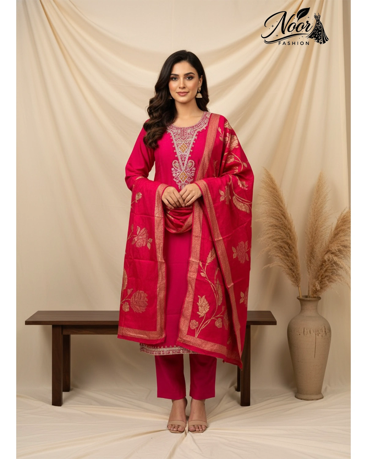 Fabric: Premium Roman Silk (Kurti & Pants) and Luxurious Banarasi Silk (Dupatta).