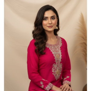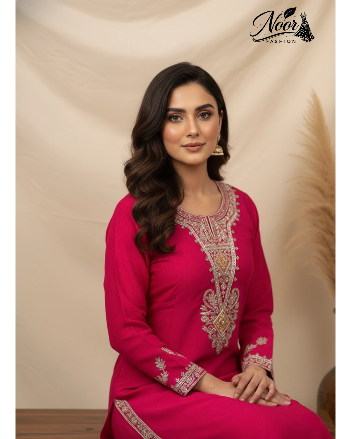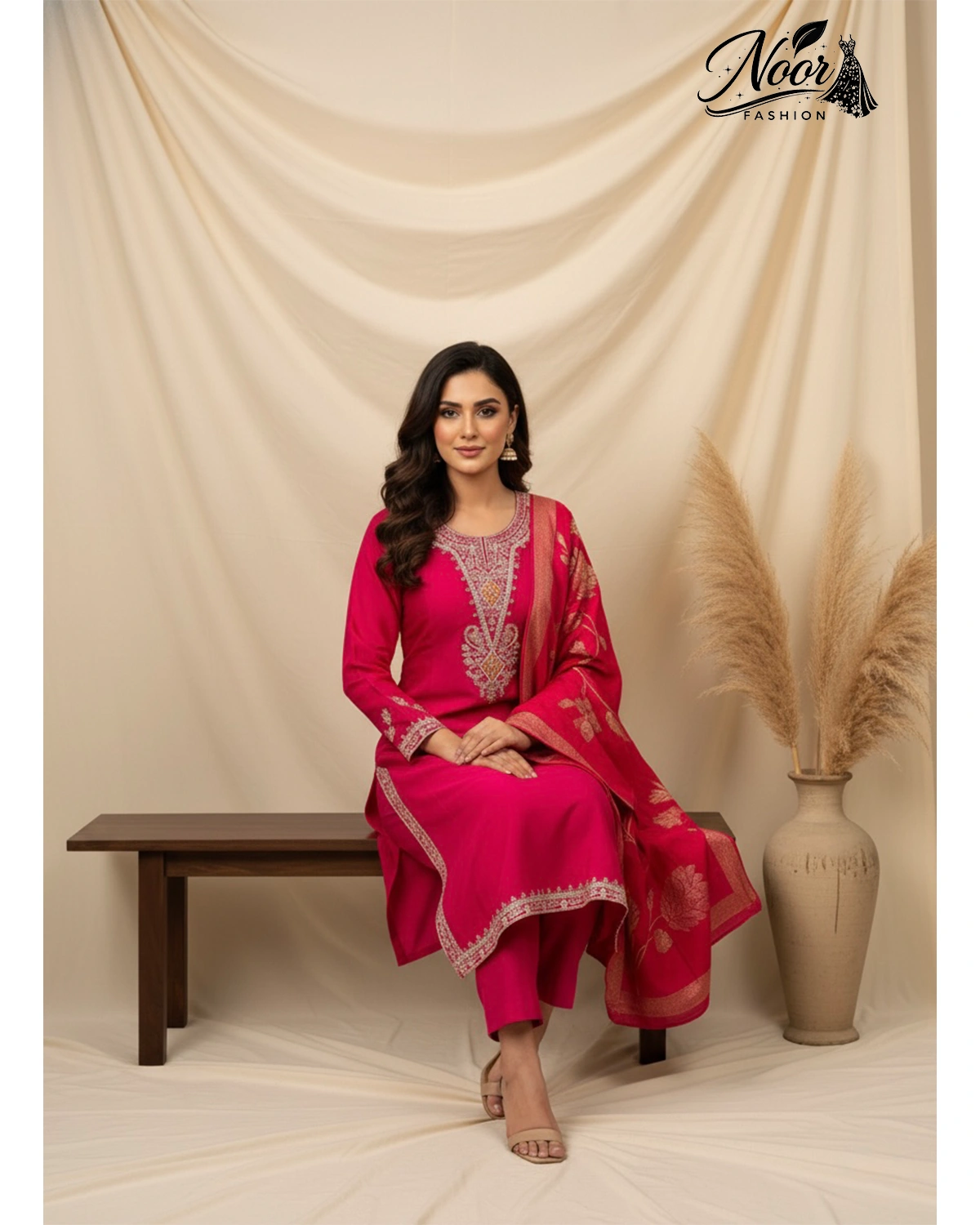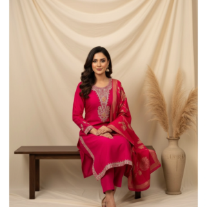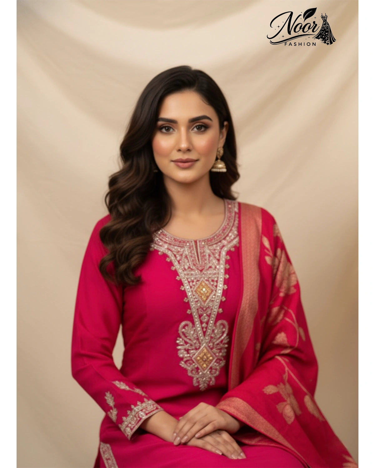 The Pants: The set includes a pair of solid magenta straight-cut trousers. Tailored from the same premium Roman silk, these pants provide a streamlined silhouette that balances the heavy ornamentation of the top and dupatta, ensuring both comfort and style.