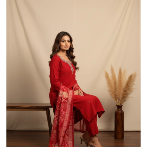 Drape yourself in the fiery brilliance of our Roman Silk Hand-Work Suit, a 3-piece masterpiece designed for the woman who seeks to make a lasting impression. This ensemble pairs the opulent, smooth texture of premium Roman silk with the ethereal, airy grace of an organza dupatta. Centered around a meticulously hand-embellished neckline, this set is the perfect marriage of traditional craftsmanship and modern, high-fashion silhouettes.