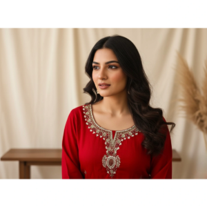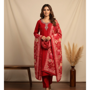 This ensemble exudes a vibe of “royal confidence.” The deep ruby red canvas is chosen for its ability to illuminate the wearer, while the Roman silk provides a structured yet fluid drape that feels as luxurious as it looks. Curated for the modern connoisseur, this suit is for the woman who values artisanal details—like the twinkle of hand-set glass beads—that transform a classic silhouette into a statement of pure ethnic glamour.