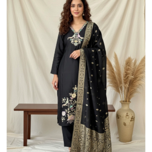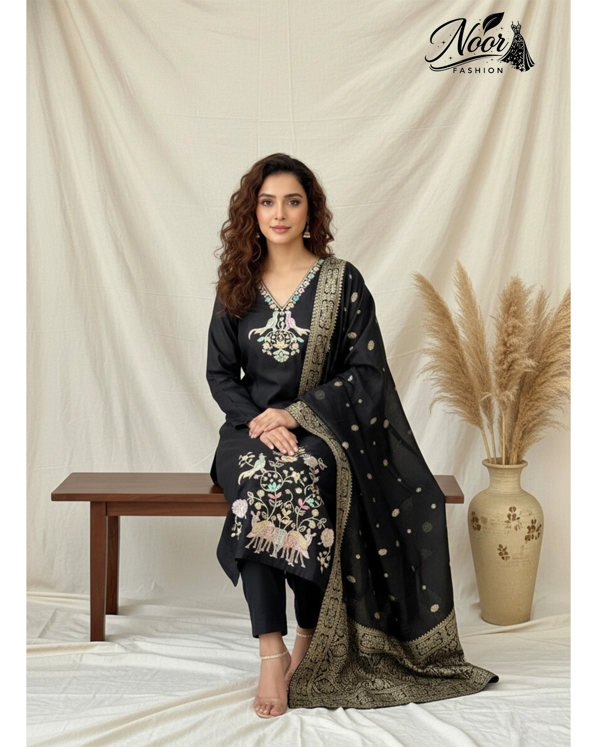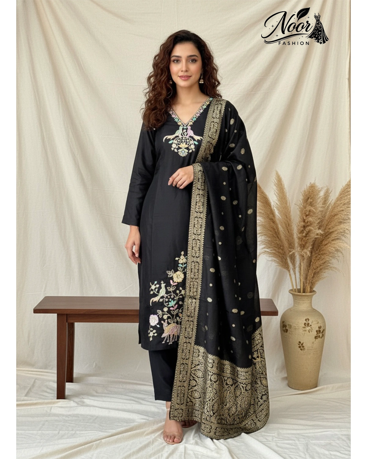 • The Pants: The set includes solid black straight-fit trousers. Tailored for a clean and streamlined silhouette, these pants provide a sophisticated, monochromatic foundation that allows the detailed handwork of the kurti and the ornate dupatta to remain the focal points.