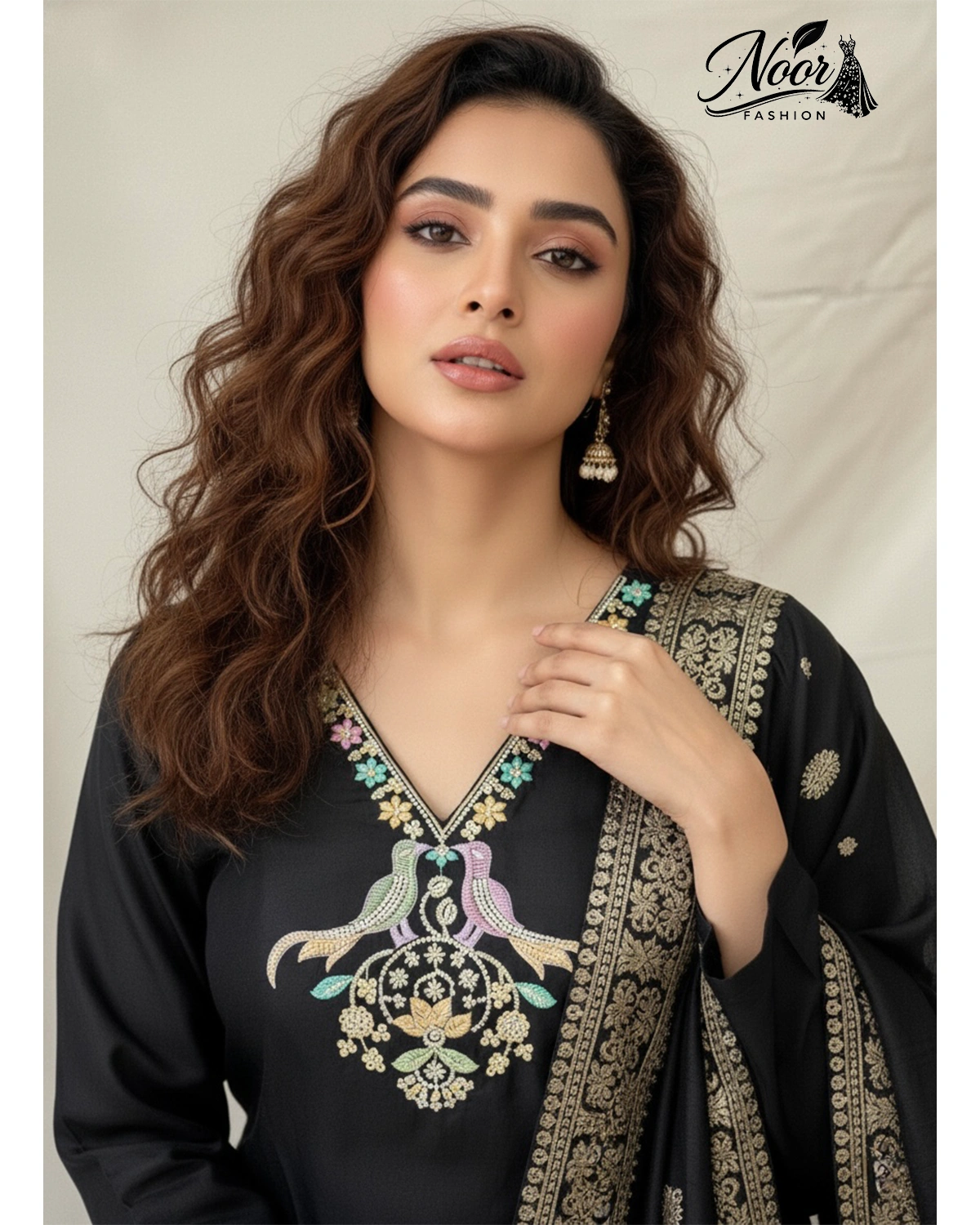 The NF578337 suit set is curated for the woman who appreciates the mystery of black paired with the intricate storytelling of fine embroidery. The “vibe” of this outfit is one of sophisticated whimsy—it balances the playful energy of nature-inspired motifs with the heavy, regal finish of gold Zari. It is a conversation starter, designed for high-profile events where you want to feel both grounded in artisanal heritage and strikingly modern.