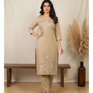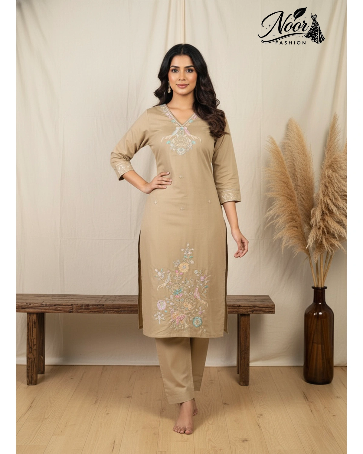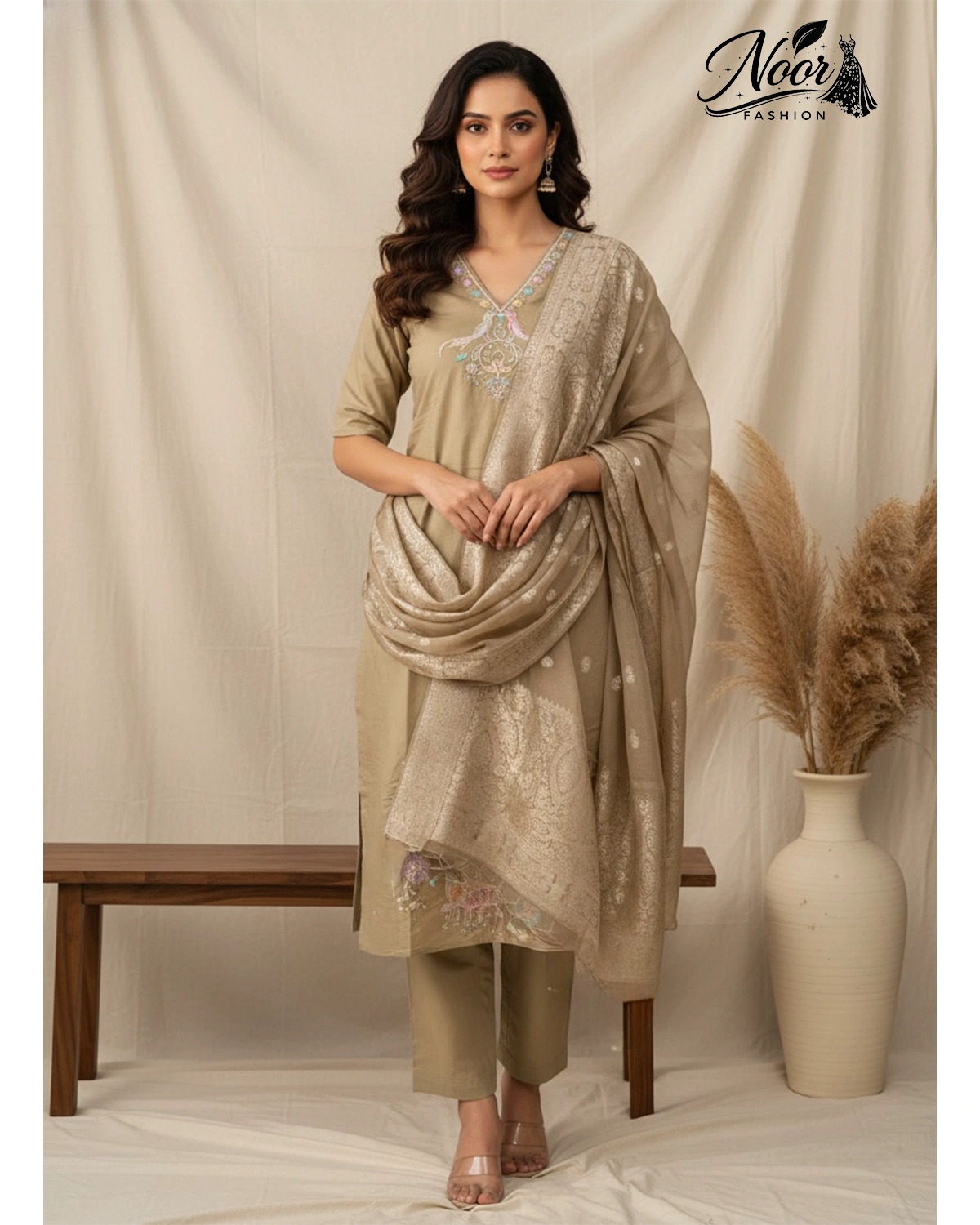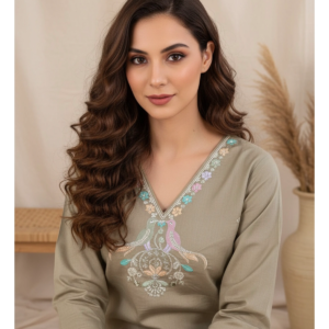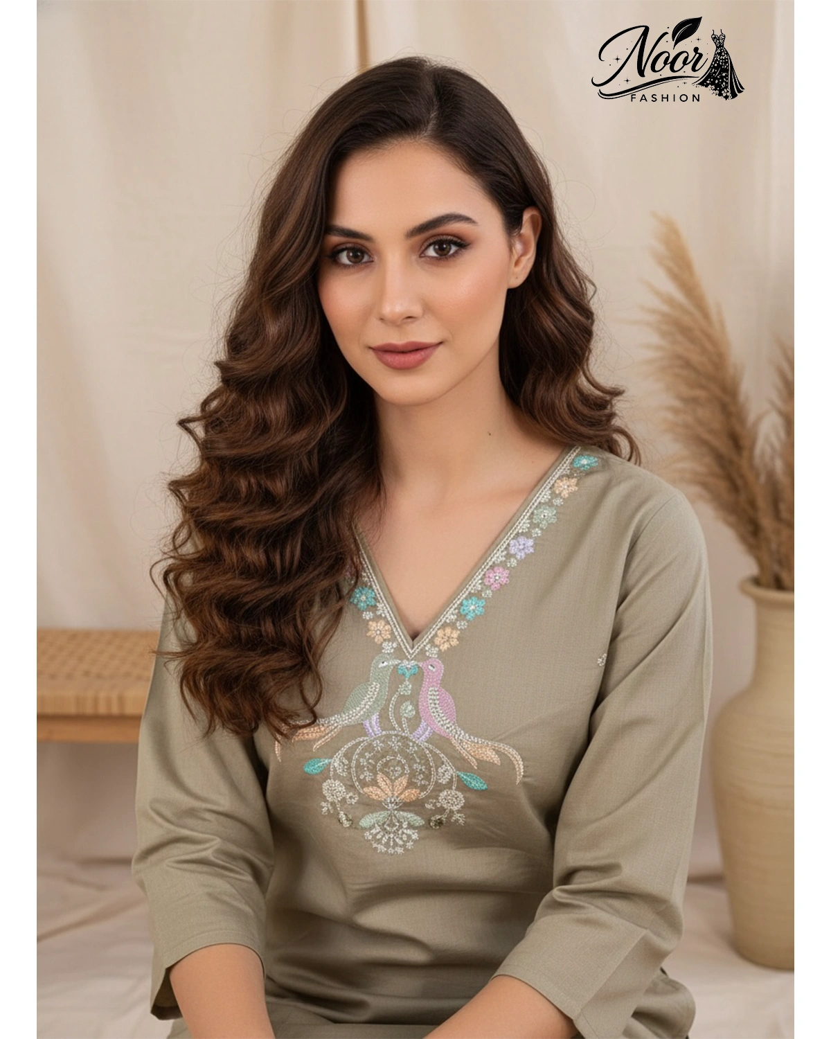 • The Kurti: Crafted from high-sheen Roman silk, the kurti features a flattering V-neckline framed by a delicate embroidered border. The centerpiece is a stunning “Nature” motif on the chest—two birds in soft pastel hues facing each other, highlighted with tiny, light-catching glass beads. This artistry continues on the lower side of the kurti with asymmetrical floral vines and additional bird motifs, creating an organic, artistic flow that breaks the monochromatic base.