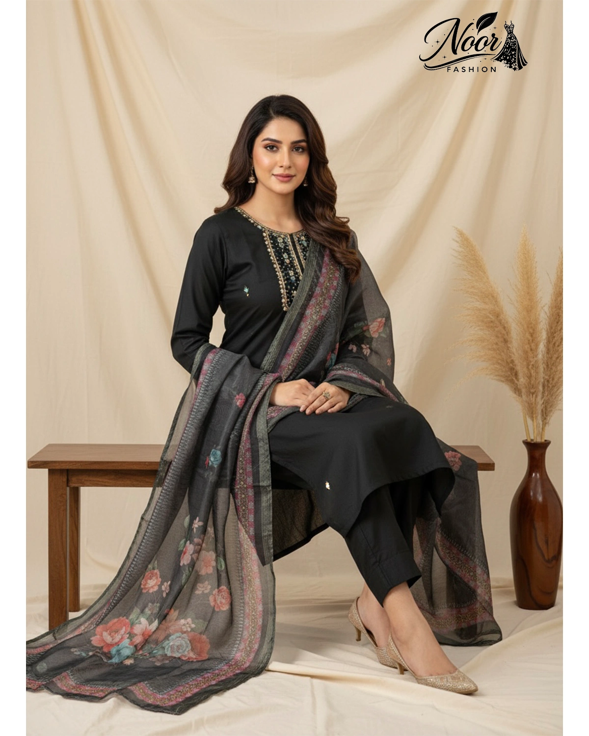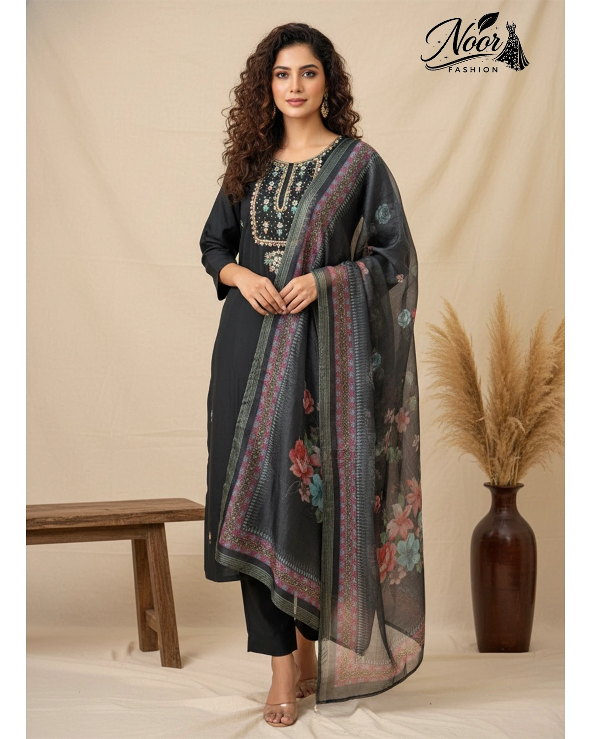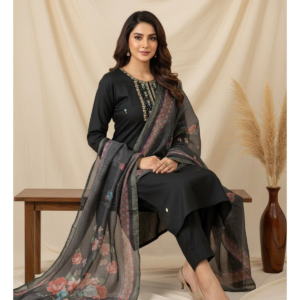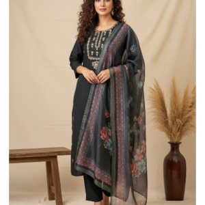 Elevate your festive wardrobe with our Roman Silk Hand-Work Suit, a 3-piece masterpiece that balances “quiet luxury” with striking artisanal details. Crafted from premium Roman silk, this set features a deep obsidian base that provides a statuesque silhouette, beautifully contrasted by a high-definition floral organza dupatta. It is an ensemble designed for the modern woman who seeks a look that is both authoritative and gracefully feminine.