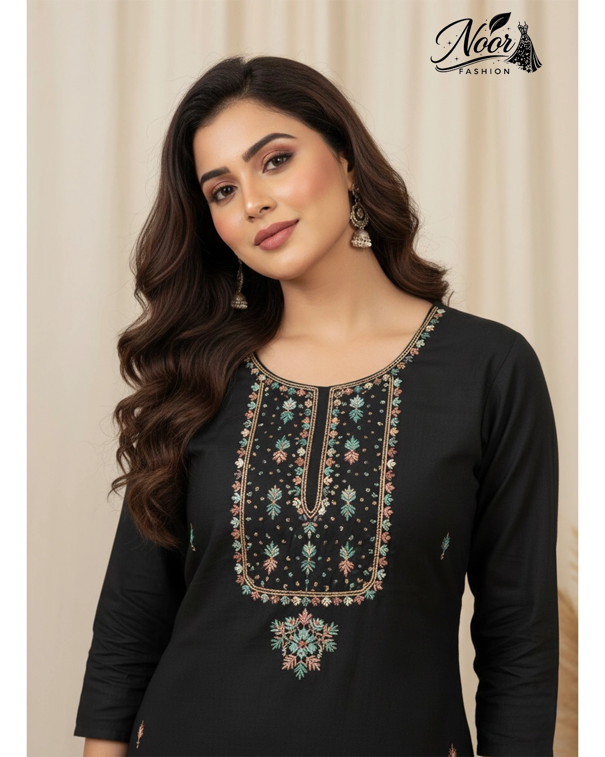 The Pants: The kurti is paired with matching solid-toned straight-fit trousers. Tailored with precision, these pants provide a sleek, minimalist anchor that ensures the intricate work of the kurti and the vibrancy of the dupatta remain the highlights.