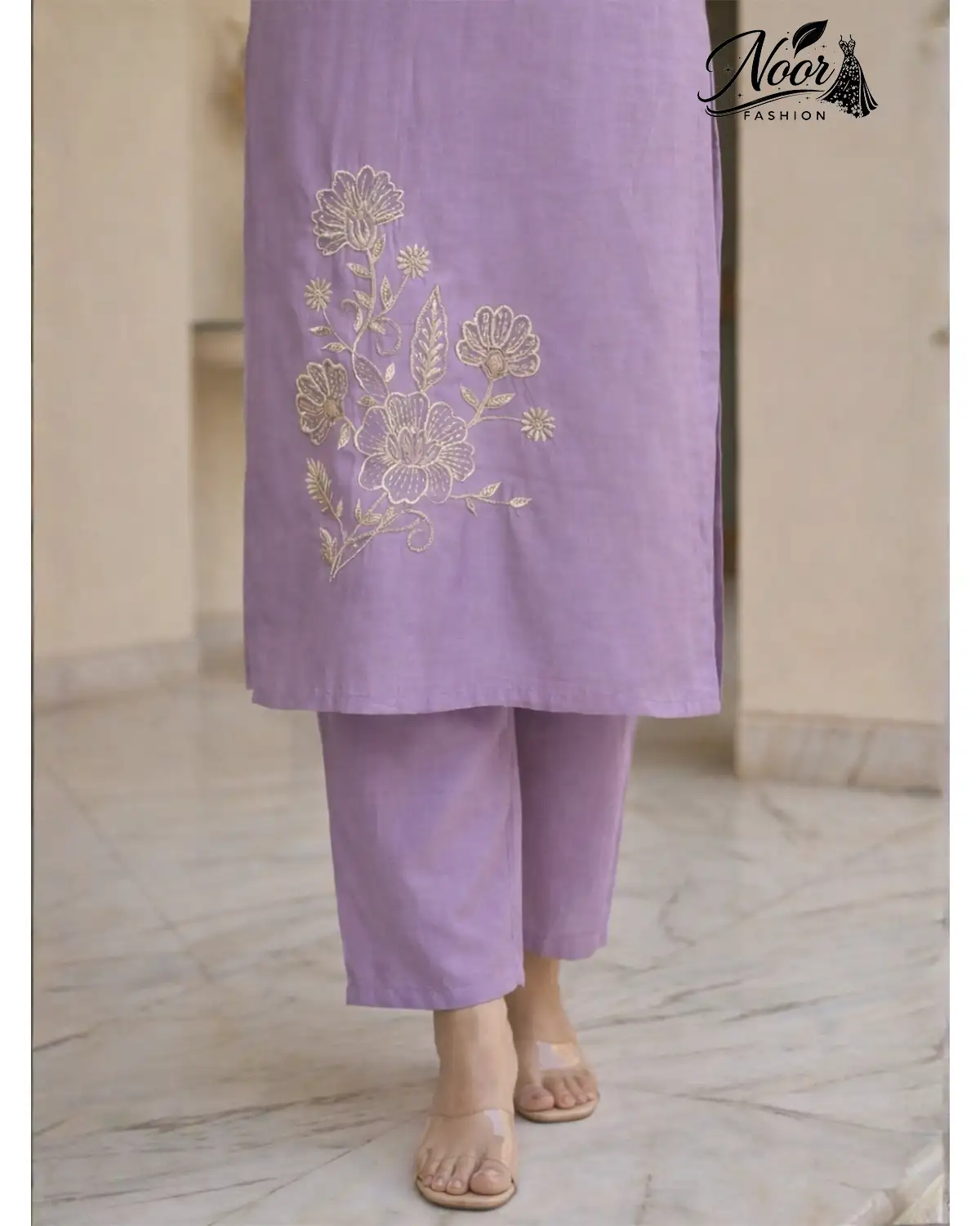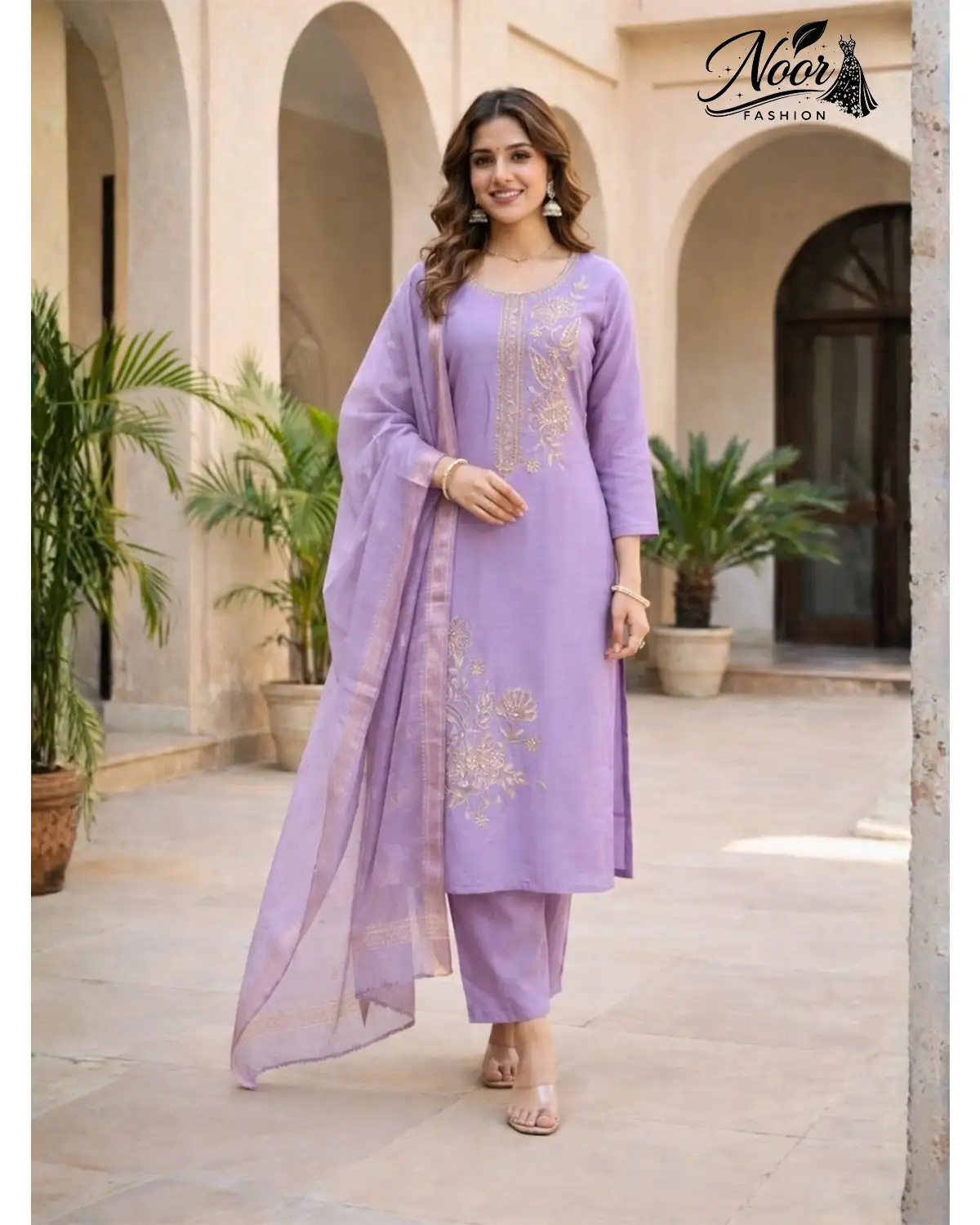 Elevate your ethnic wardrobe with the breathtaking Roman Silk Suit with Gold Handwork, a masterpiece designed for the woman who values grace, comfort, and timeless style. Whether you select the serene Lavender or the romantic Pink, this 3-piece ensemble (SKU: NF322118) promises to transform your festive look into a vision of sophistication.