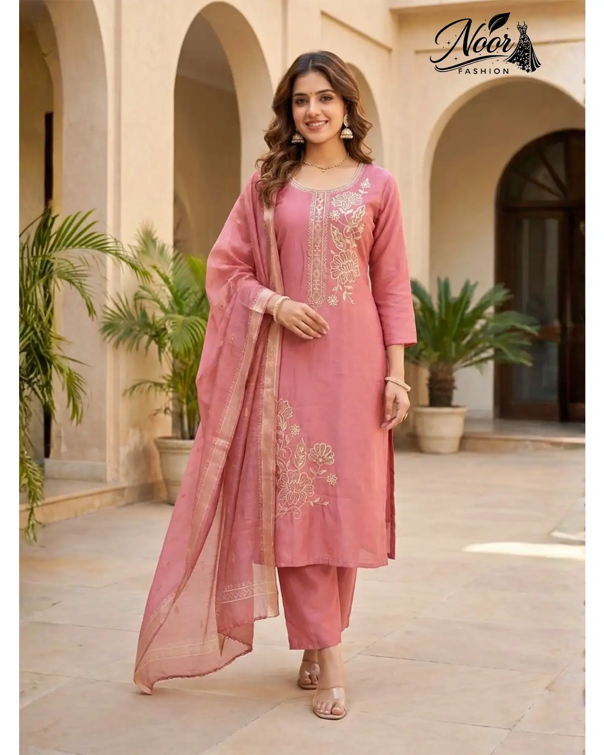 Jewelry: Since the neckline is round and the embroidery is gold, pair this suit with gold Jhumkas or Chandbalis (as seen in the images). A delicate gold chain or a choker can also work wonders.