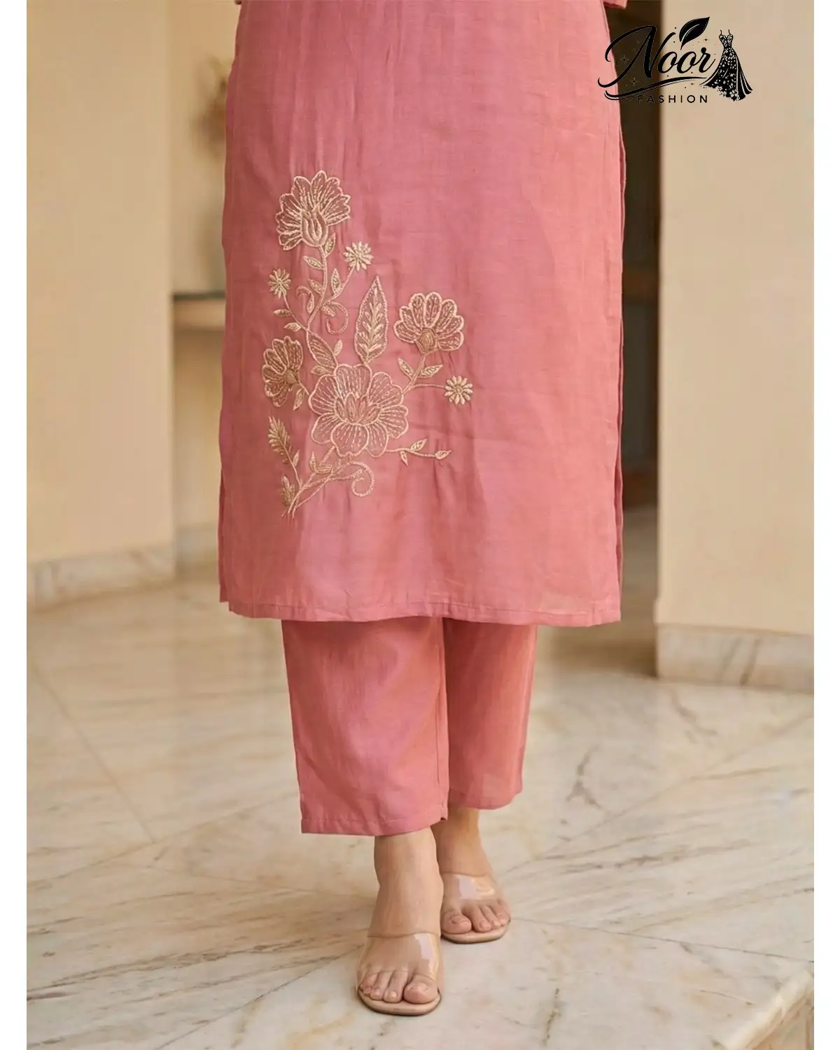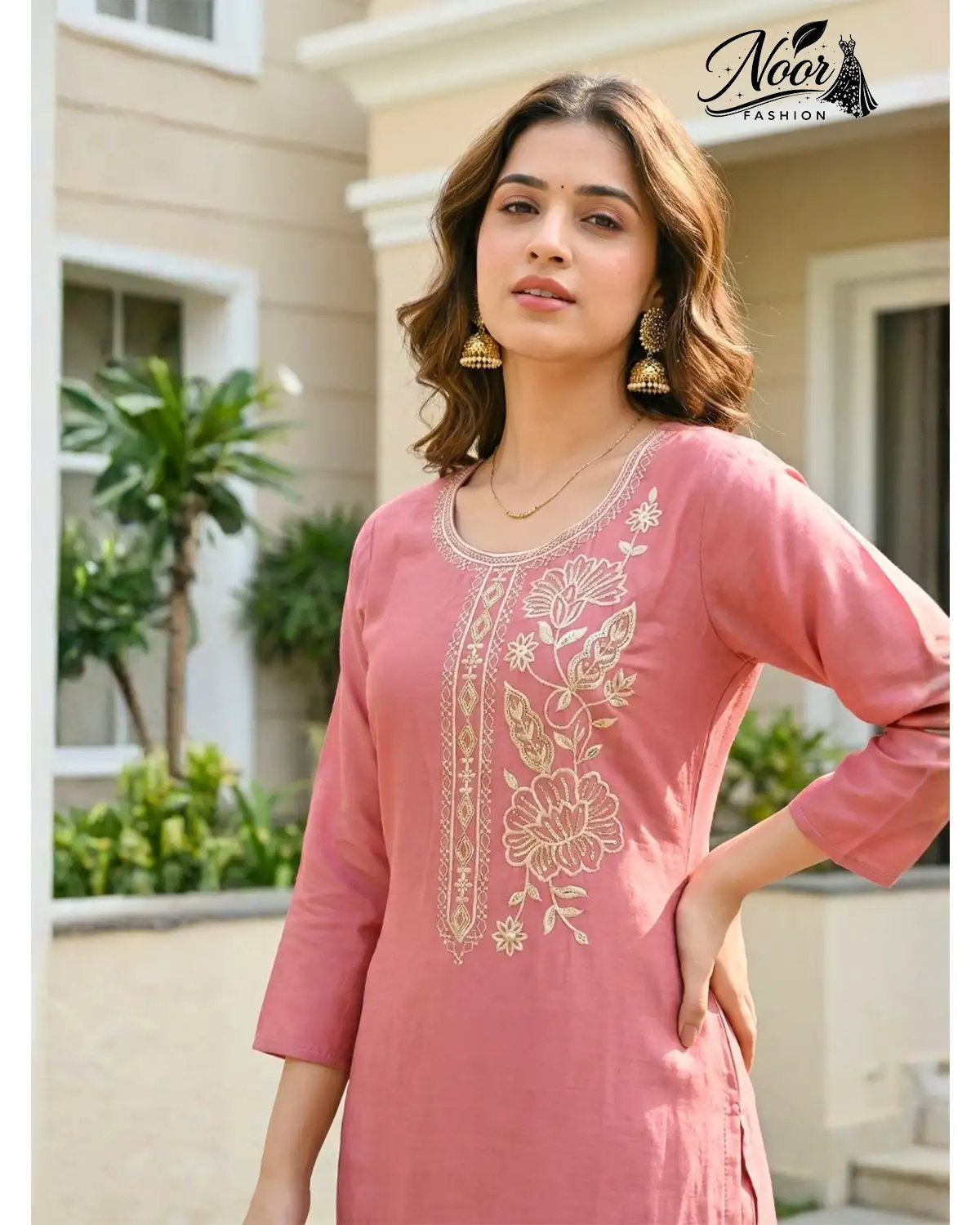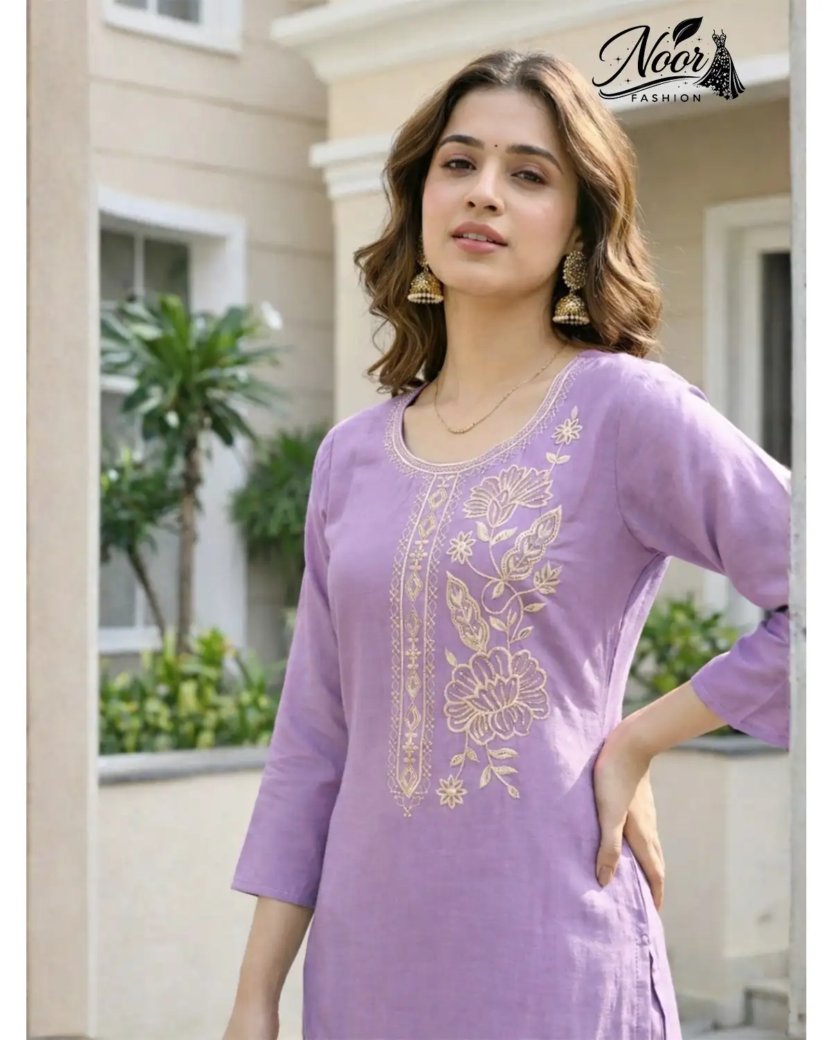 Neckline & Sleeves: The simple yet elegant round neckline is framed with fine embroidery, drawing attention to your collarbones. The 3/4th sleeves are finished with a matching gold motif, adding a touch of completeness to the silhouette.