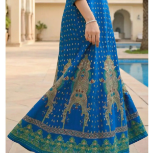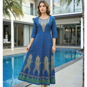 Radiate elegance in the Royal Gala Cotton Anarkali. This premium gown features intricate embroidery and gold foil prints. Available in Blue & Pink. Shop now!