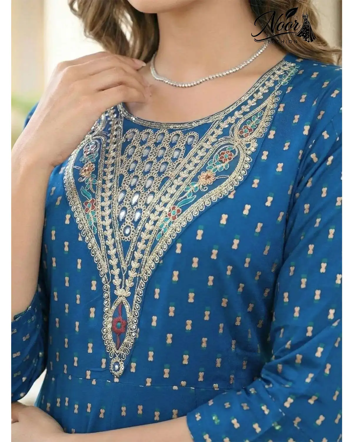 Statement Yoke Embroidery: As seen in the close-up images, the neckline is the focal point. It features a heavy, elongated yoke adorned with intricate thread work in gold and silver tones, accented with mirror-like foil work. This design mimics the look of a heavy necklace, adding a jewelry-like effect to the dress.